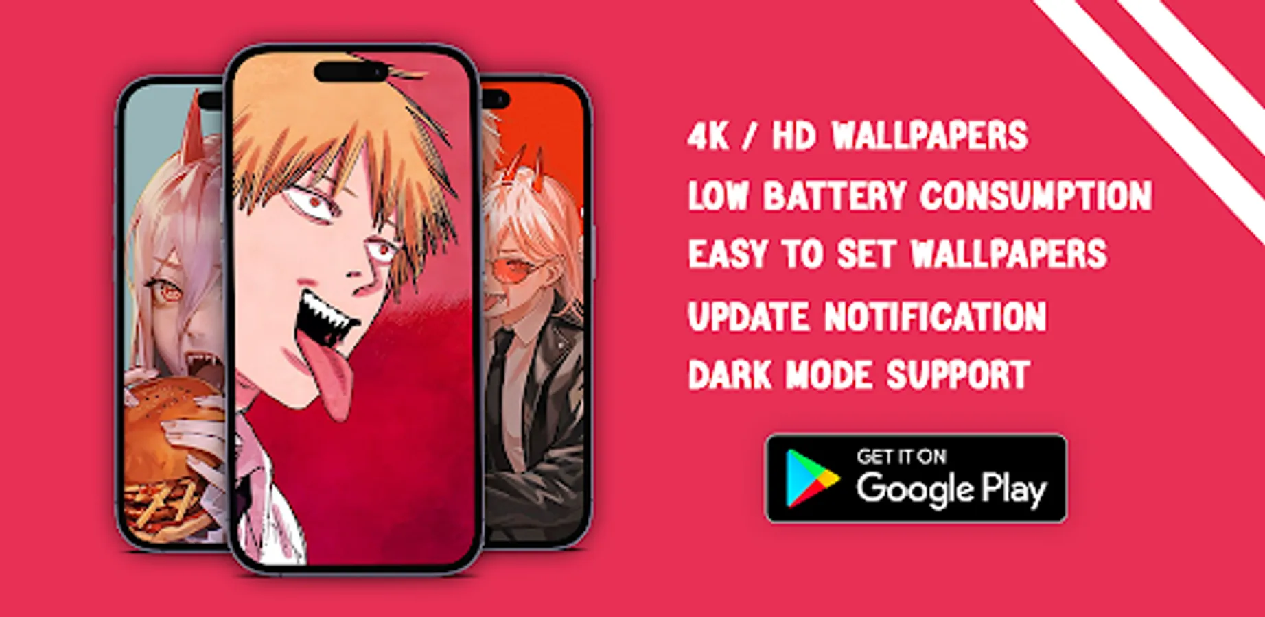 The Chainsaw Man Wallpapers Application Has Many Features, The First of Which is Low Battery Consumption, High Quality Images, and Easy to Set Wallpapers on Your Phone, and You Can Save The Wallpapers in Your Device and Share Them With Your Friends, Support Dark Mode, Update Notification