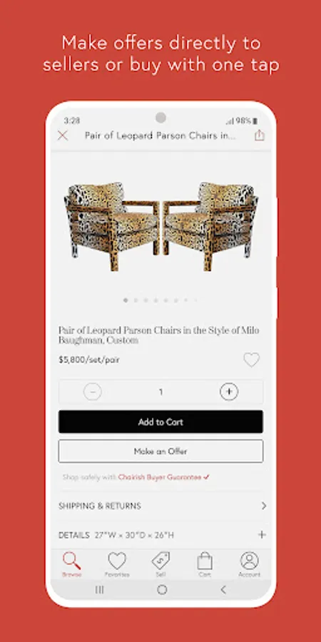 Our app also allows sellers to easily submit items for sale. All submissions are reviewed by our curation team and, if accepted, go live on our marketplace quickly. Chairish offers a variety of shipping options to meet your needs and capabilities.