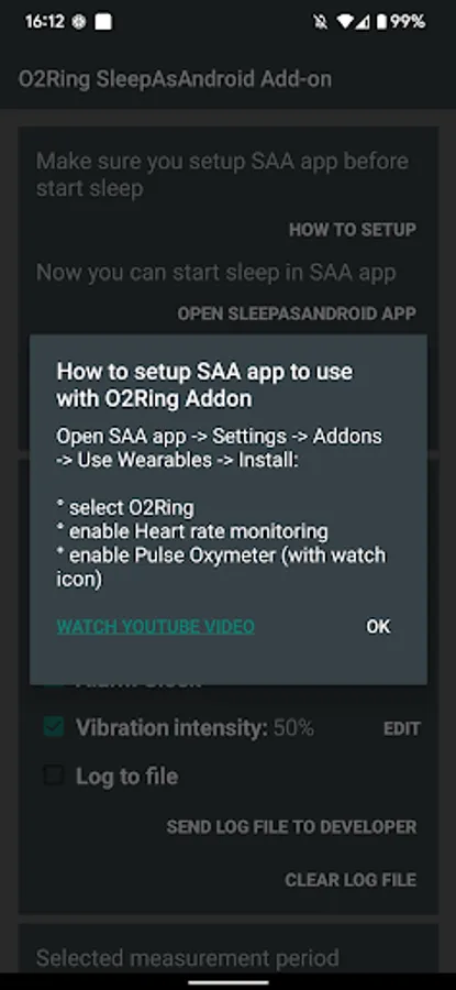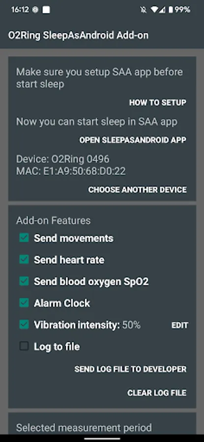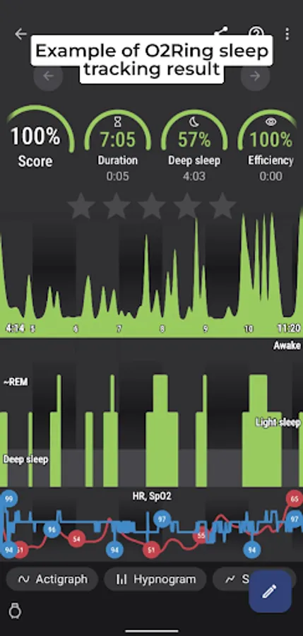 Use your O2Ring ring to gather data for sleep tracking with Sleep as Android app (download from Play Store: https://play.google.com/store/apps/details?id=com.urbandroid.sleep )
