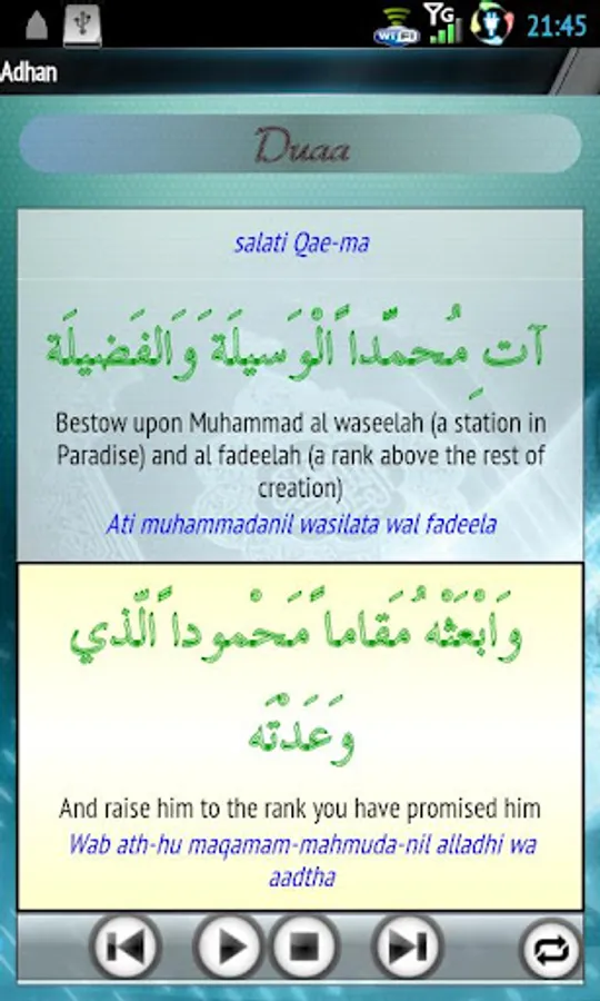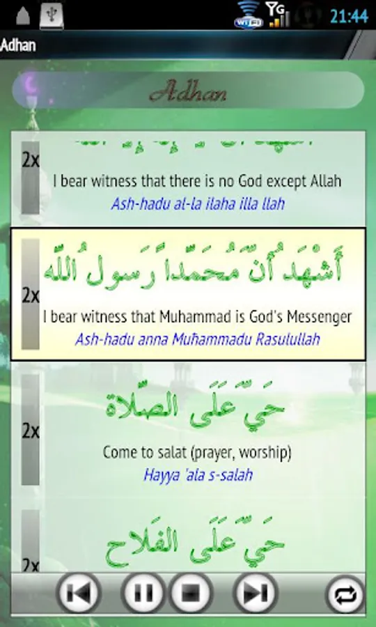 This application is aimed to learn and listen to the Adhan recited by different muezzins. The adhan is divided into parts that you can listen several times and that come with the translation and the transcription (you can disable in the preferences).