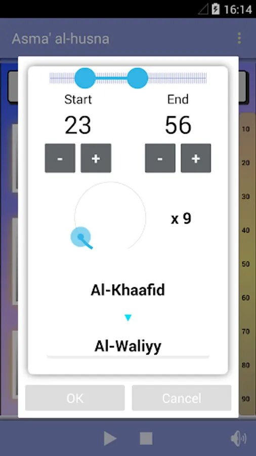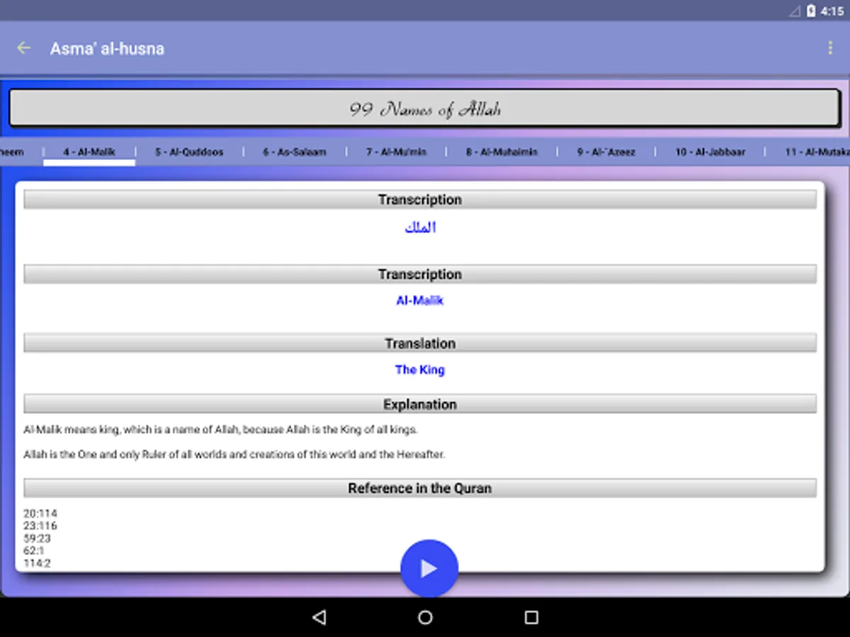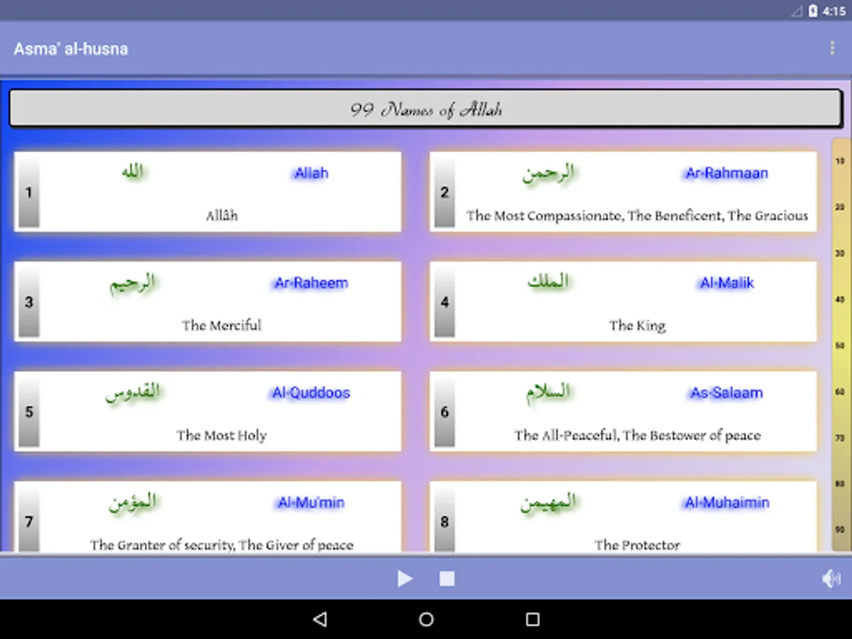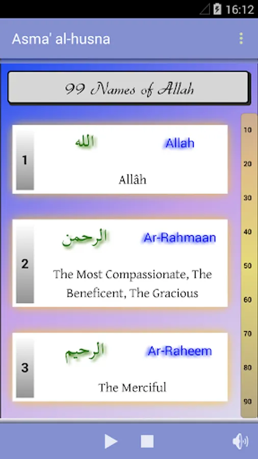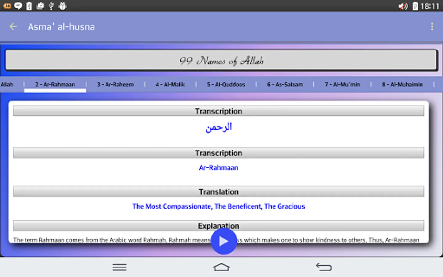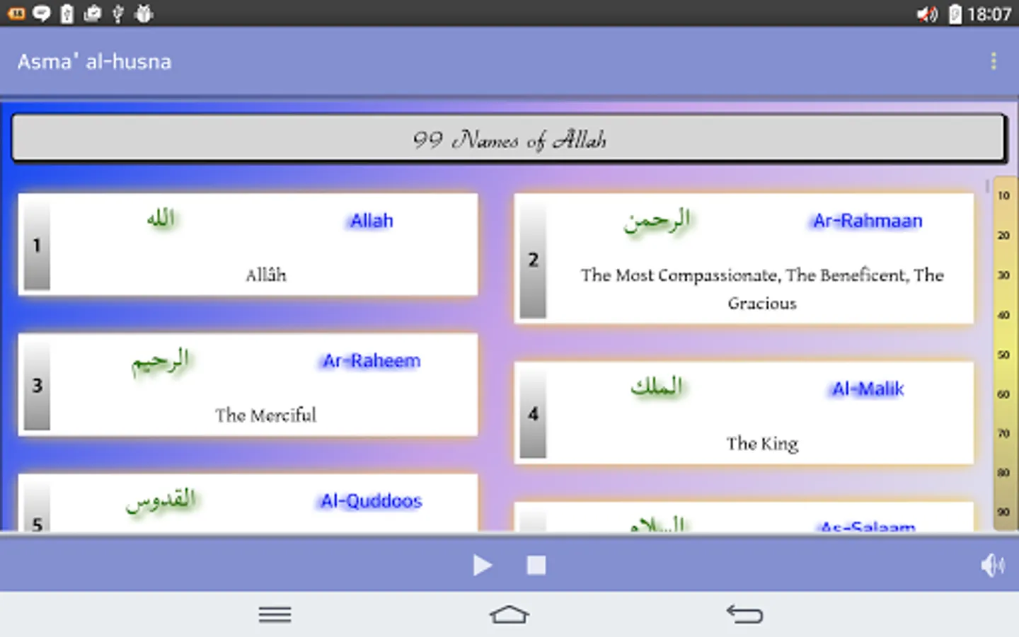 The 99 names of Allah in Islam. Each name is displayed in arabic with its transcription and translation. You can also learn the names thanks to the audio playback.