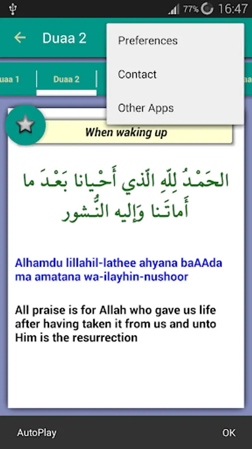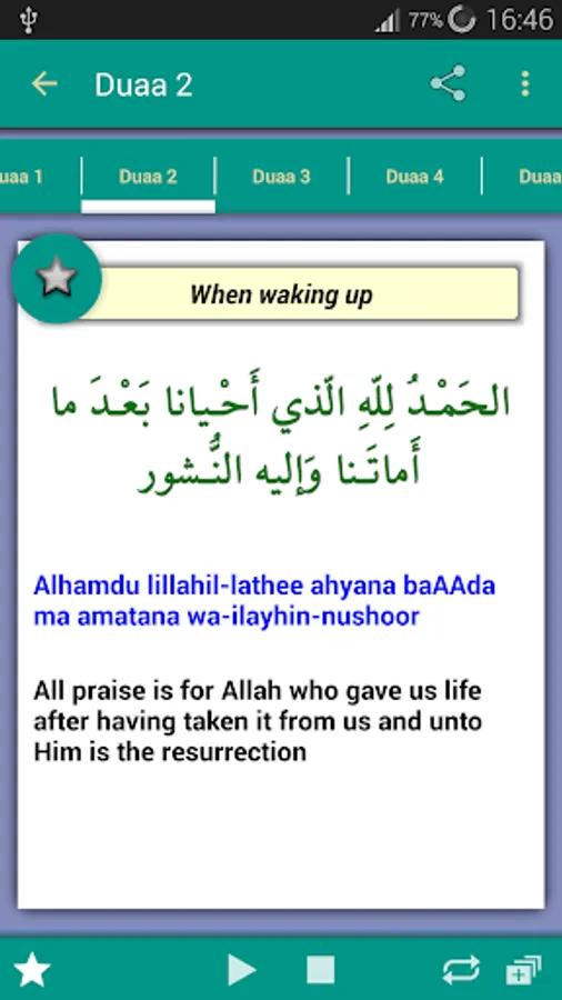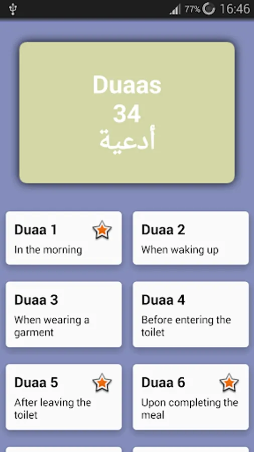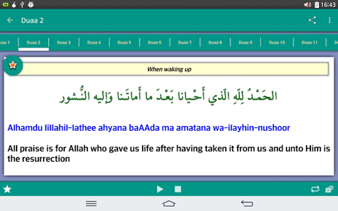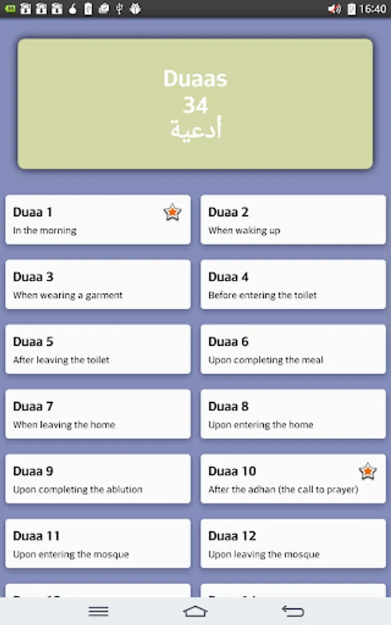 This application is a collection of 34 duaas with audio for each Dua with translation and phonetic transcription.