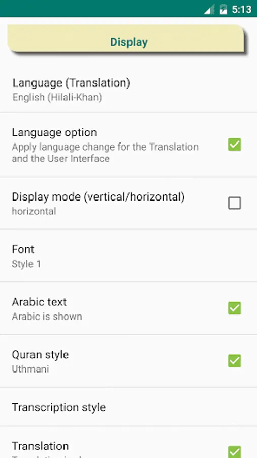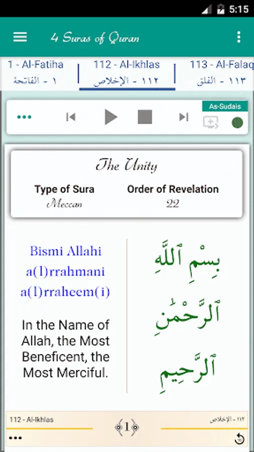 Each sura is translated into many languages and contains its transcription. Also, you can listen to each Ayat.