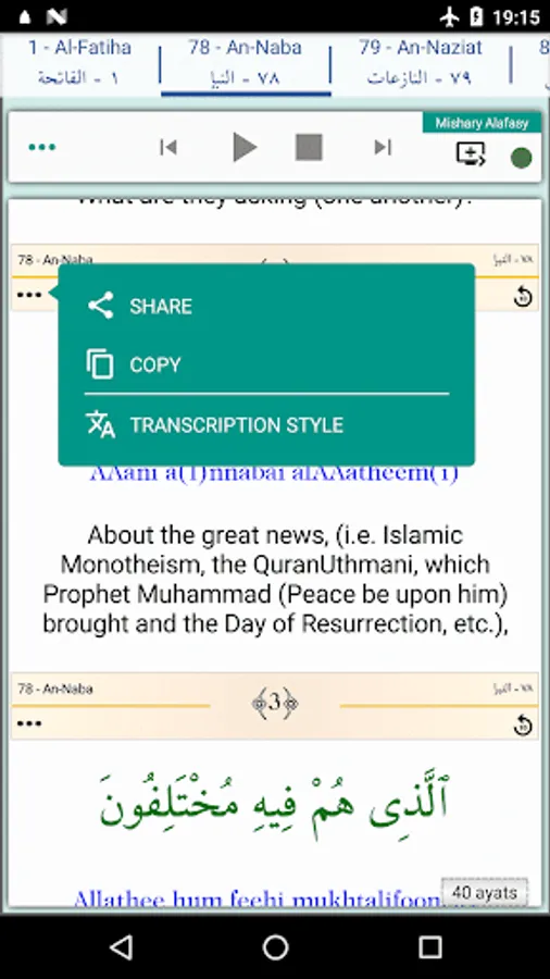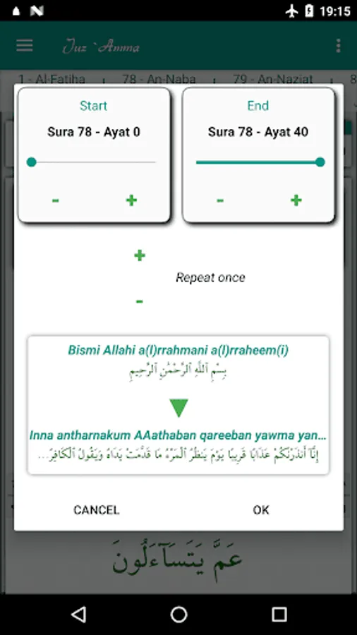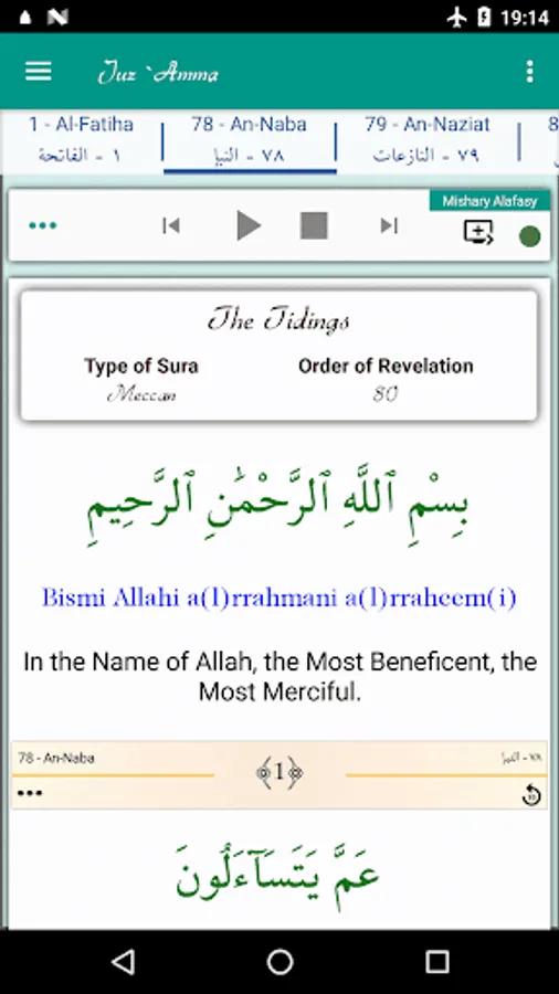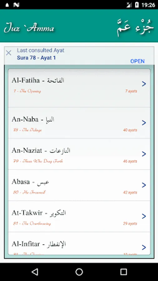 This application contains Juz Amma (Last chapter of the Quran from Surah 78 to Surah 114) and Al-Fatiha. Each sura is displayed with its original verse (in arabic) and also with its translation and transliteration.