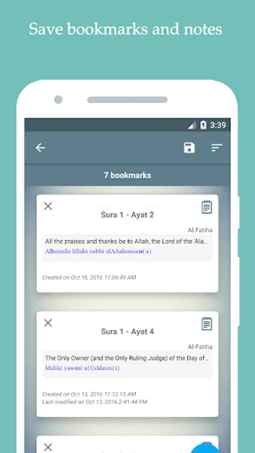 • To save an Aya and take notes, we have added a system of favorites accessible in a simple way.