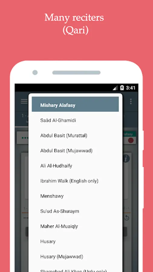 • Listen and learn the recitation of the Qur'an with the greatest reciters (Qari / Sheikh / Imam) such as Mishary Alafasy, Saad Al-Ghamidi, As-Sudais or AbdulBasit AbdulSamad (Murattal, Mujawwad).
