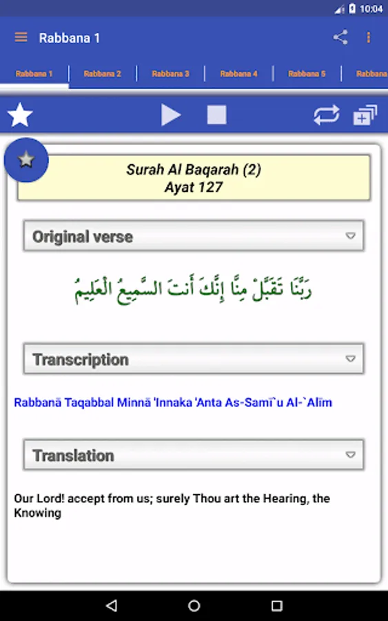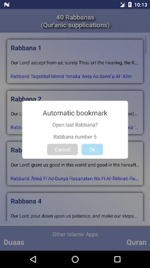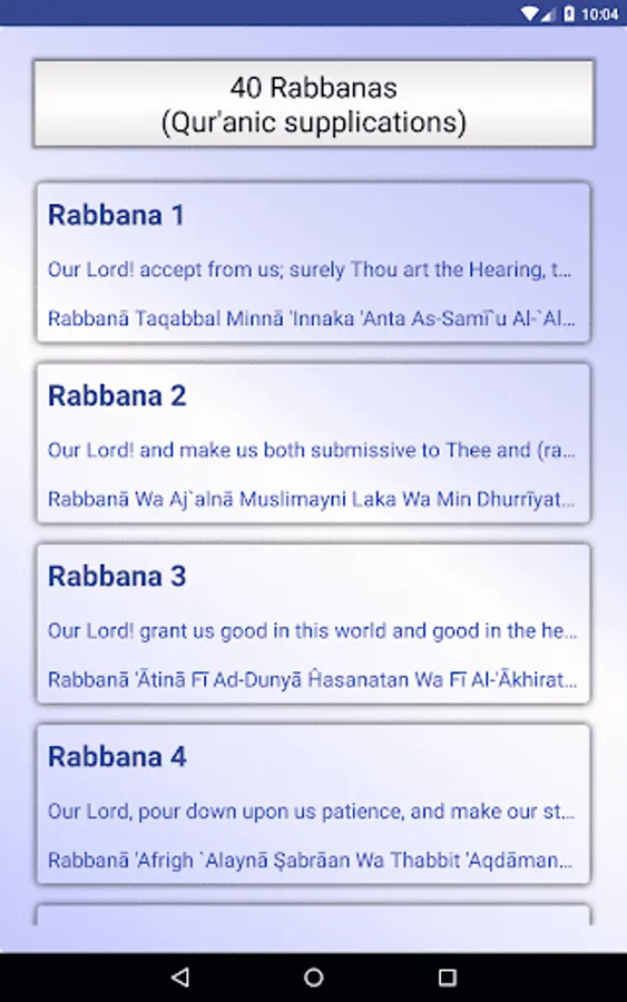 This application is a collection of 40 Duas (Duʿā' - invocations) of the Qur'an that begin with the word "rabbana - رَبَّنَا"(Our Lord).