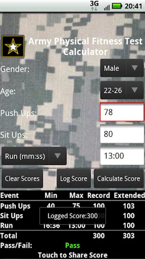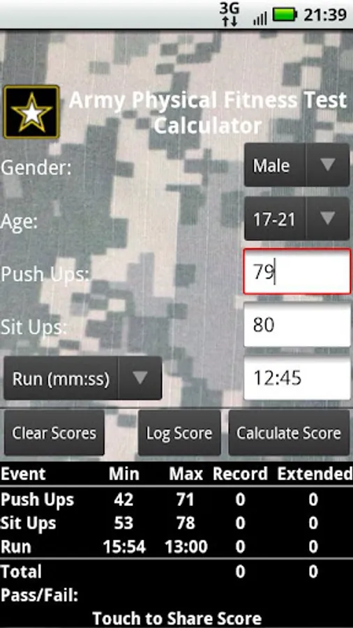 This application can calculate your Army Physical Fitness Score based on the APFT standards listed in FM 21-20.