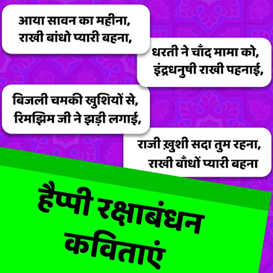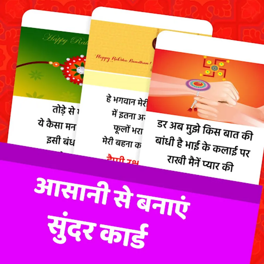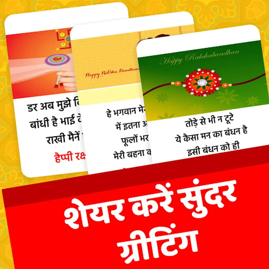 इस ऐप में आपको मिलता है 100+ शायरी और कविताओं का संगम और इसमें आपको शायरी और कविता को एक कार्ड के रूप में प्राप्त करते है जिससे ये शेयर करने में बिलकुल आसान हो जाता है ये ऐप बिलकुल छोटे साइज में बनाया गया है जिससे इसे आप किसी भी स्मार्टफोन में डाउनलोड करके रक्षाबंधन के अवसर पर शुभकामनाएं शेयर कर सकते है।