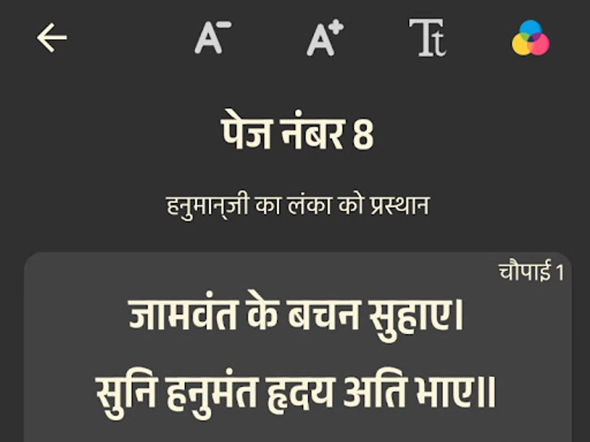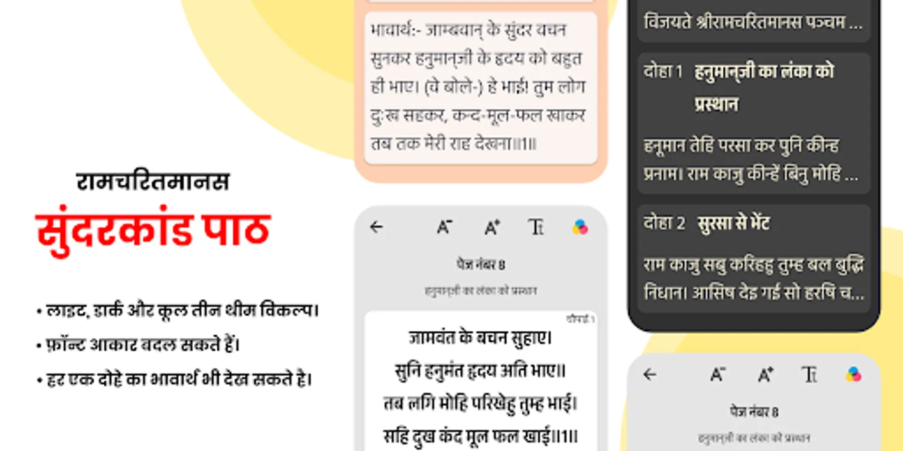 इस ऐप में आपको तीन अलग तरह की थीम्स मिलती है लाइट, डार्क और कालम साथ ही आप विवरण स्क्रीन पर टेक्स्ट का फ़ॉन्ट आकार भी अपनी सुविधा अनुसार बदल सकते हैं। आप यह भी सेट कर सकते हैं कि आपको दोहा को उनके अर्थ के साथ दिखाना चाहते हैं या नहीं। सभी फीचर को रीडर्स की सुविधा के अनुसार जोड़ा गया है ताकि आप बिना किस समस्या के सुंदरकांड का पाठ कर सके।
