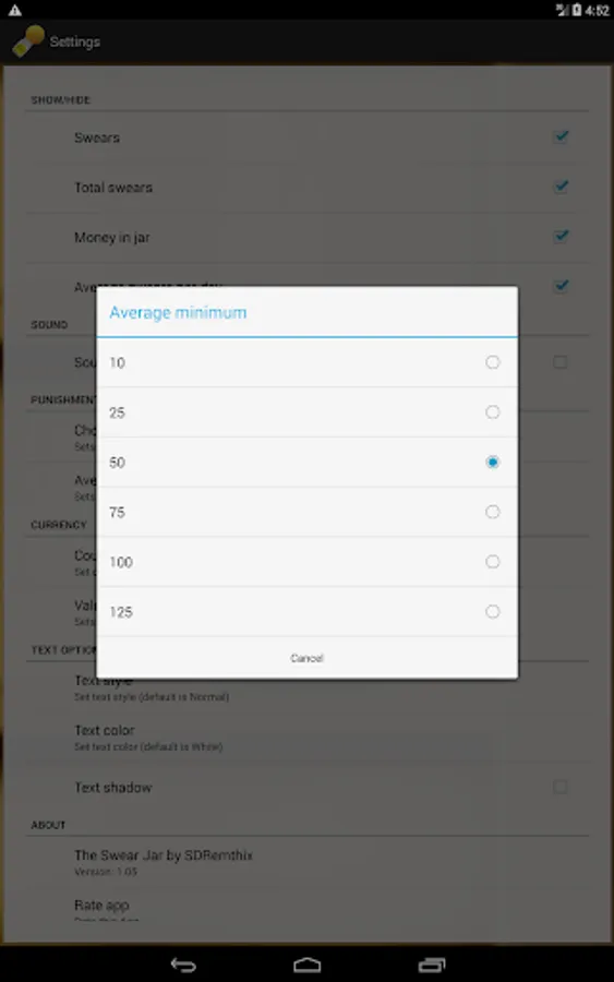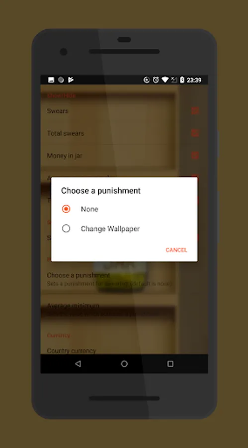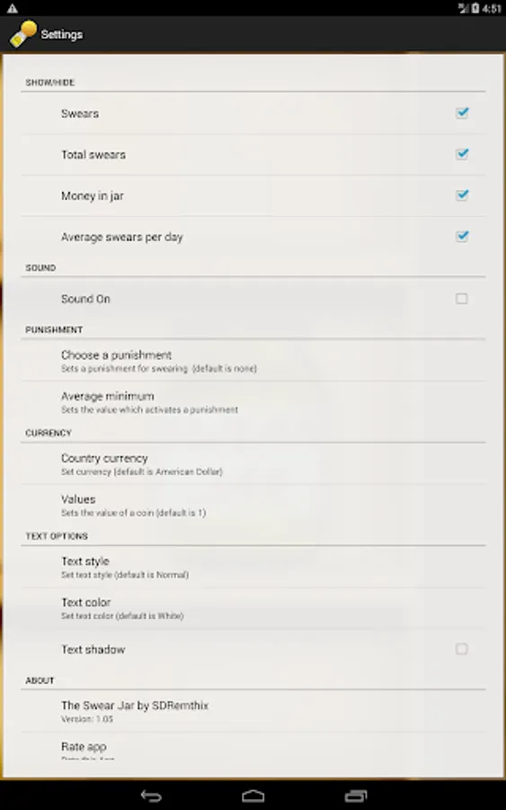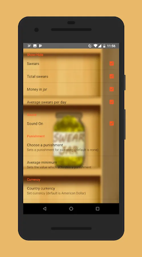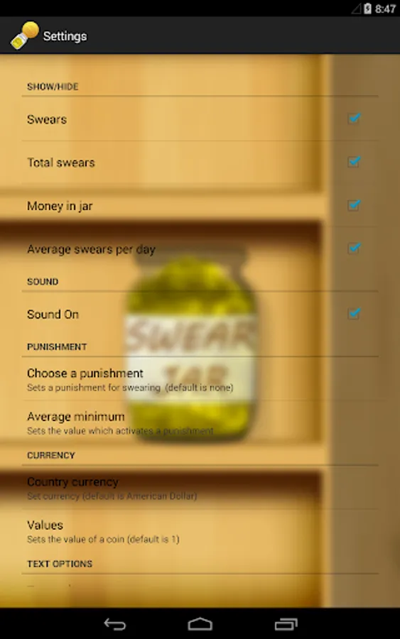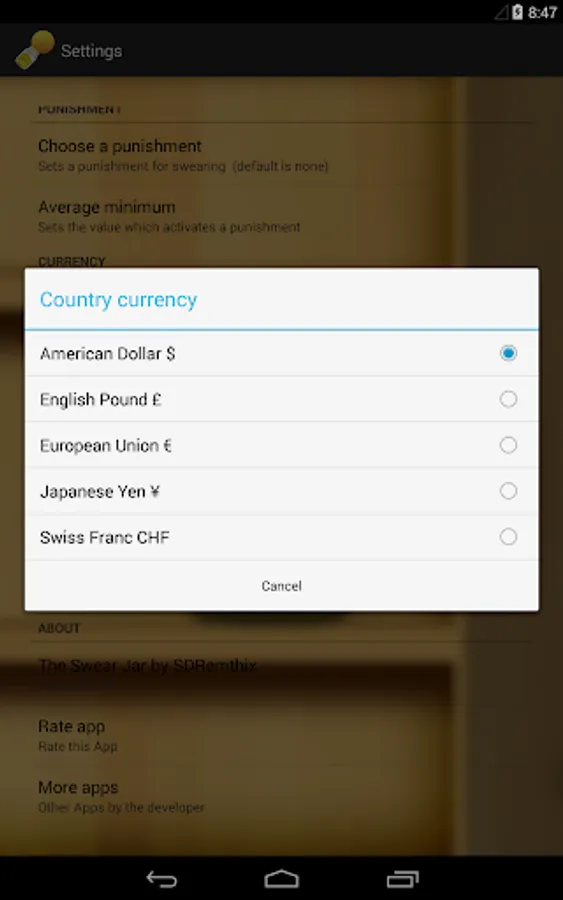 The Swear Jar has a minimalistic but customizable user interface and its very easy to use. You can easily change the desired currency and currency values. Unlike other similar apps, this app has an integrated punishing system* which is used to purposely annoy** the user. The Swear Jar hurts your devices wallpaper instead of your wallet..