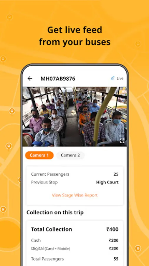 See current passenger count in all your buses, along with stage-wise boarding and deboarding data and live camera feed. Receive up-to-date trip and shift end reports, complete with trip-wise passenger count and collection details for the buses which are running with Chalo ticketing machines.