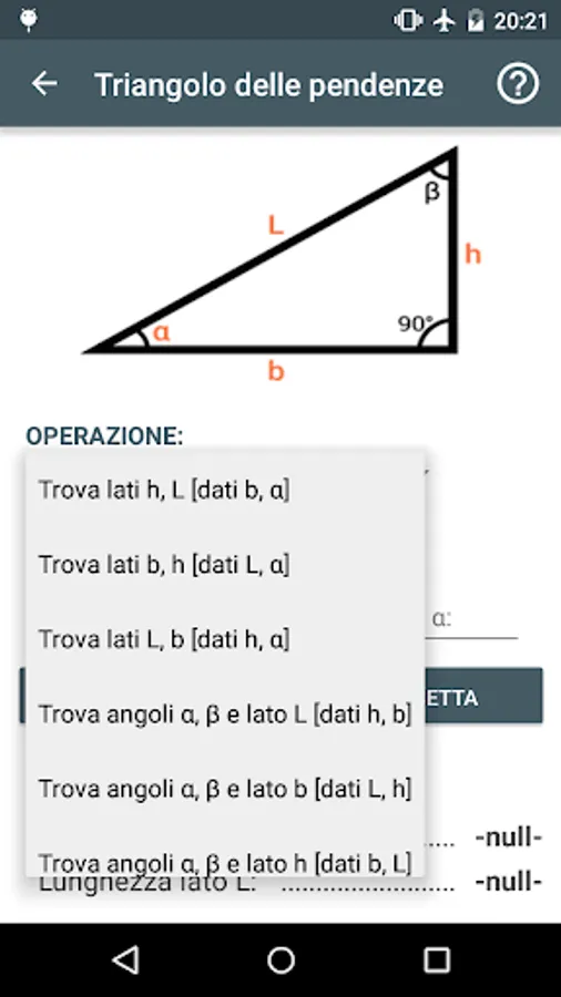 - Triangle rectangle of the slopes: used for the schematization of the fundamental formulas of trigonometry applicable in carpentry, for which starting from a side and a corner you can get the remaining;
