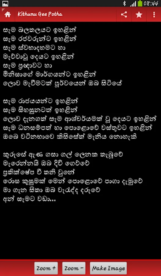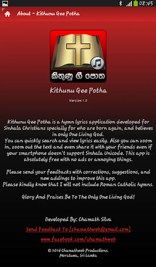 Kithunu Gee Potha is a hymn lyrics application developed for Sinhala Christians specially for who are born again, and believes in only One Living God. You can quickly search and view lyrics easily. Also you can zoom in, zoom out the text and even share it with your friends even if your smartphone doesn’t support Sinhala Unicode. This app is absolutely free with no ads or annoying things.