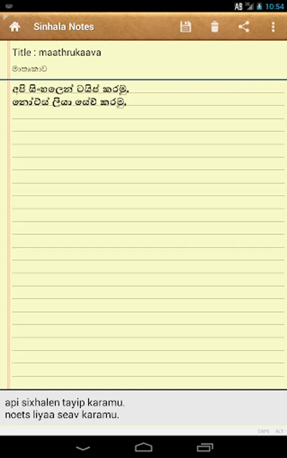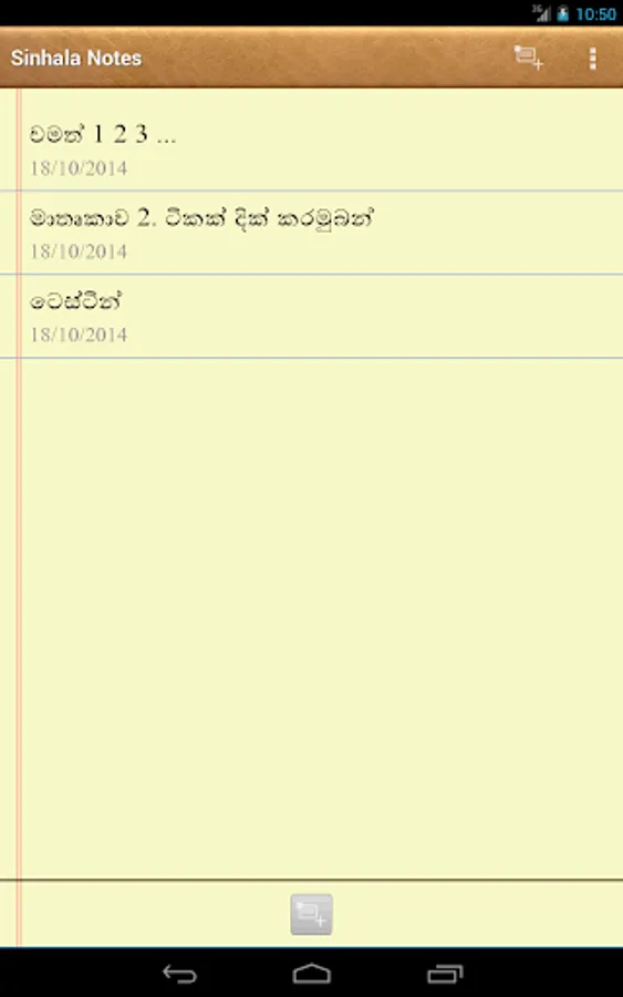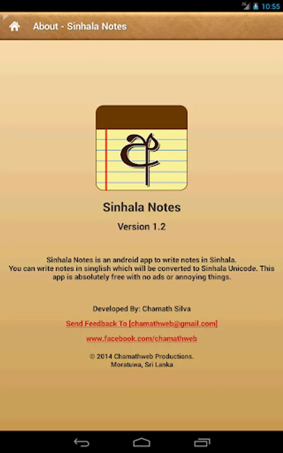 Sinhala Notes is an android app to write notes in Sinhala. You can write notes in singlish which will be converted to Sinhala Unicode. Also you can edit, delete and share notes. This app is absolutely free with no ads or annoying things.