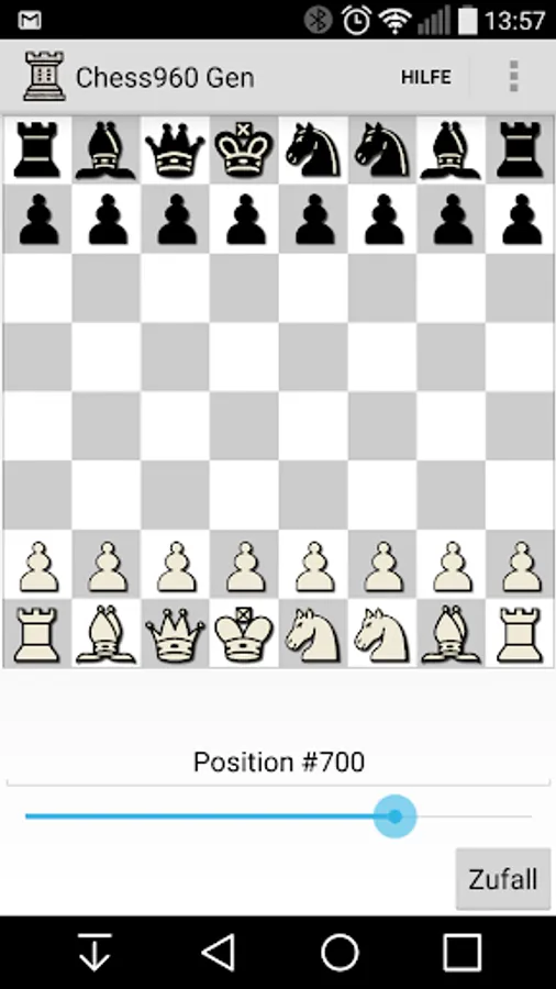 This application serves to generate one of the possible 960 starting positions of the chess variant Chess960 (Fischer-Random-Chess).