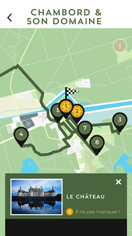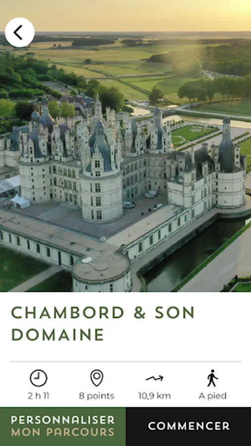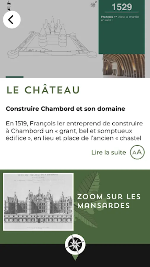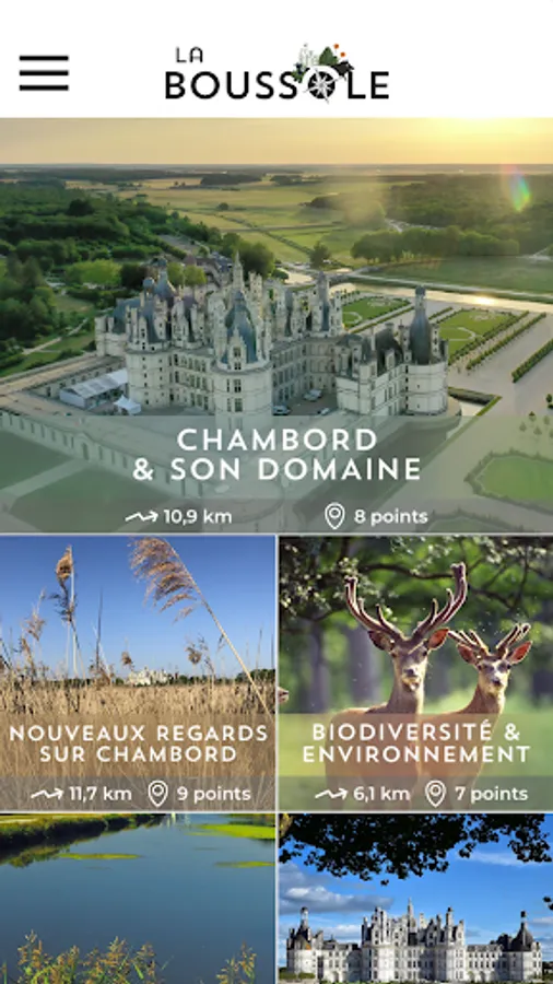 La Boussole invites you to (re) discover Chambord through twenty-one points of interest, enriched with new high-quality content, made fun and accessible through interactive experiences. It guides the walker through personalized thematic routes, generated by a multi-criteria algorithm, taking into account the user's needs, desires and constraints. These routes are designed around five main themes: