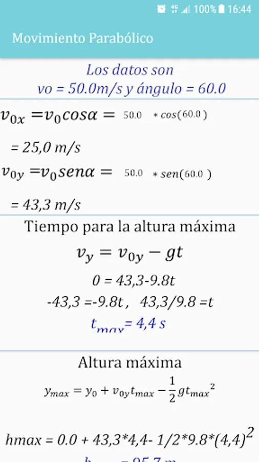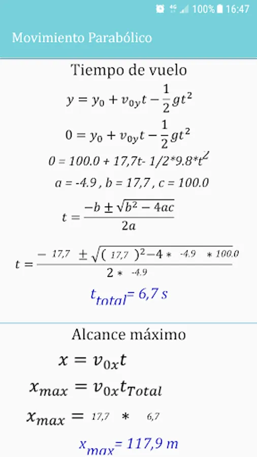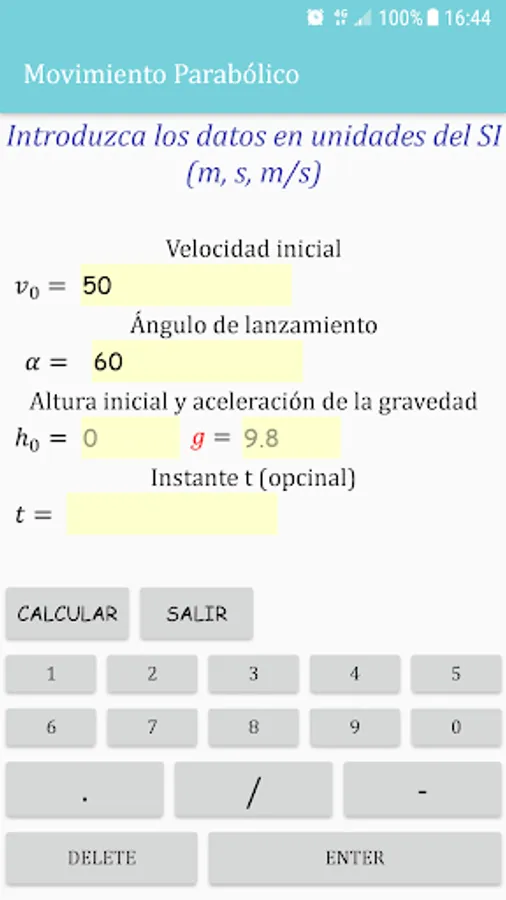 As an aid, default values of the initial height (zero) and the acceleration of gravity (9.8 m / s2) are given, but these can be changed at your choice.