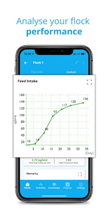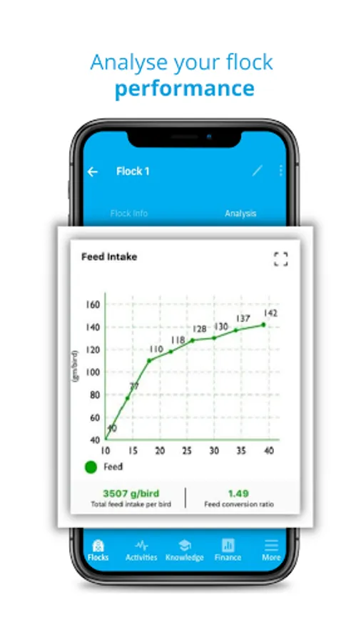 • Feed intake: The application will help you track total feed usage, total feed intake per bird, and average feed intake per bird.