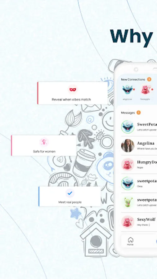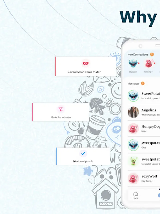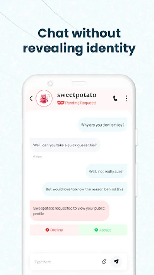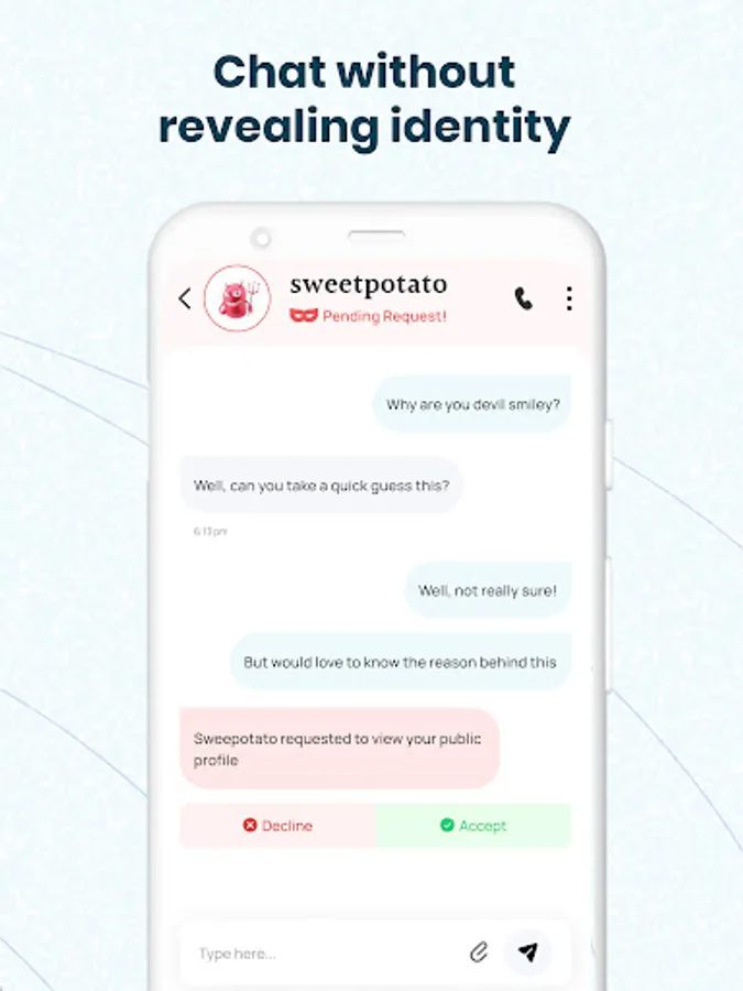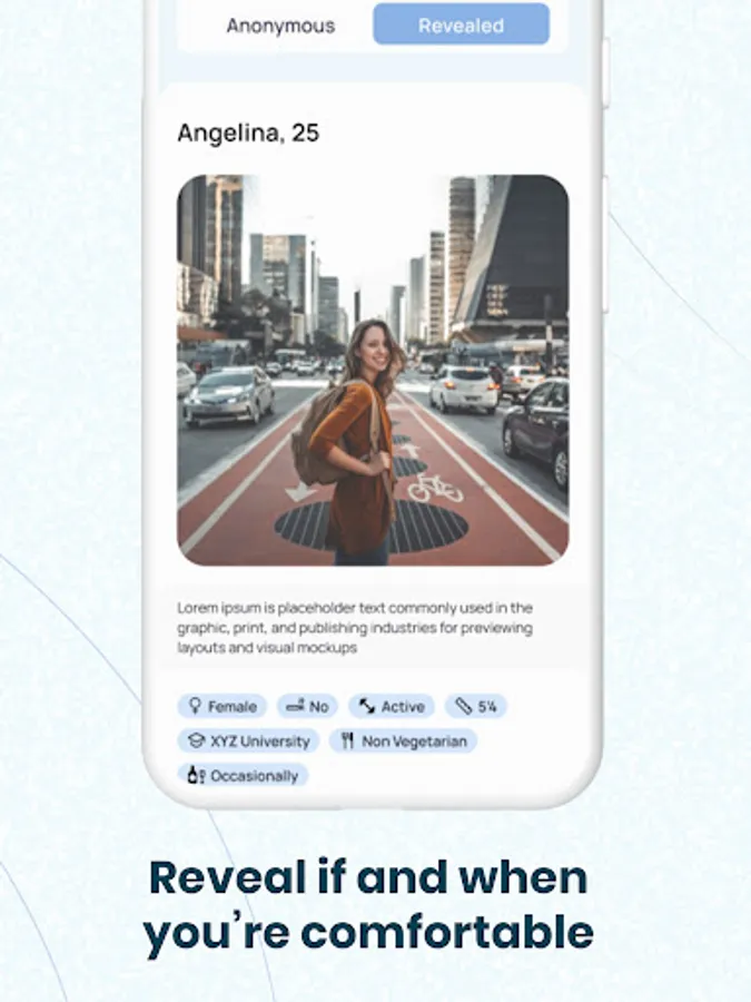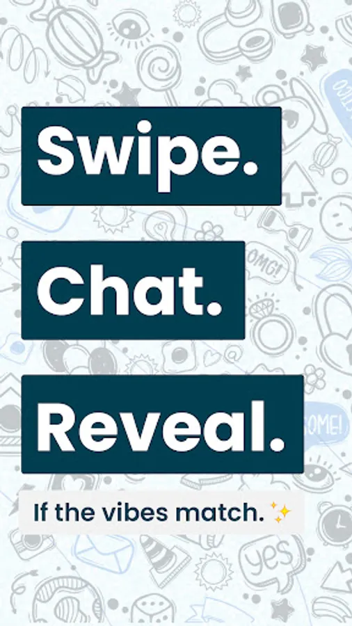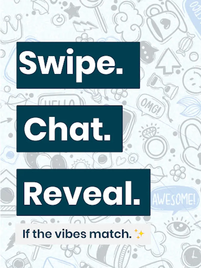 Presenting a new chat and date app where you meet people that match your personality while staying anonymous. Chat first without revealing your identity then reveal yourself if your vibes match! Meet people who are smart, interesting, and fun on this fantastic and free dating app. Whether you are looking for a local dating app or an online dating app to meet international singles, this swipe dating app is your right choice.