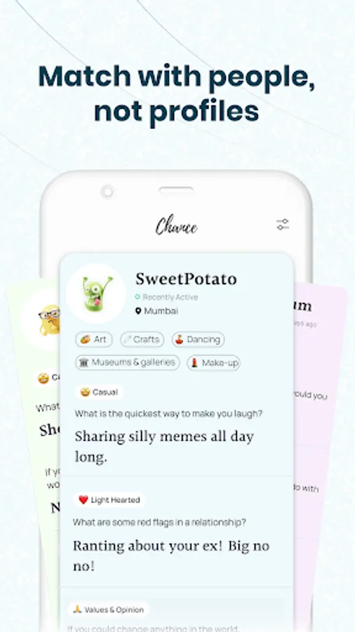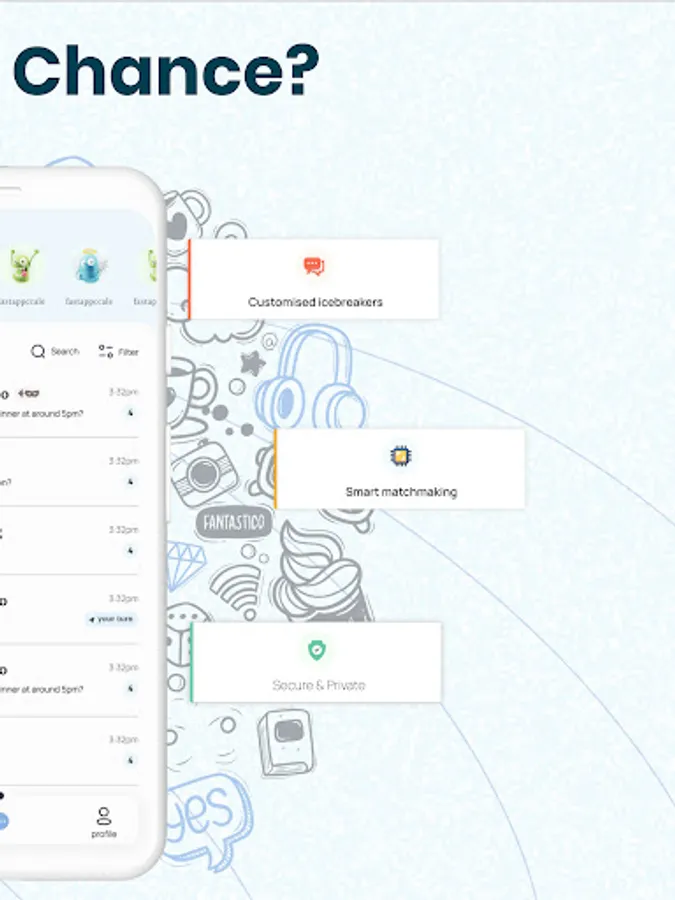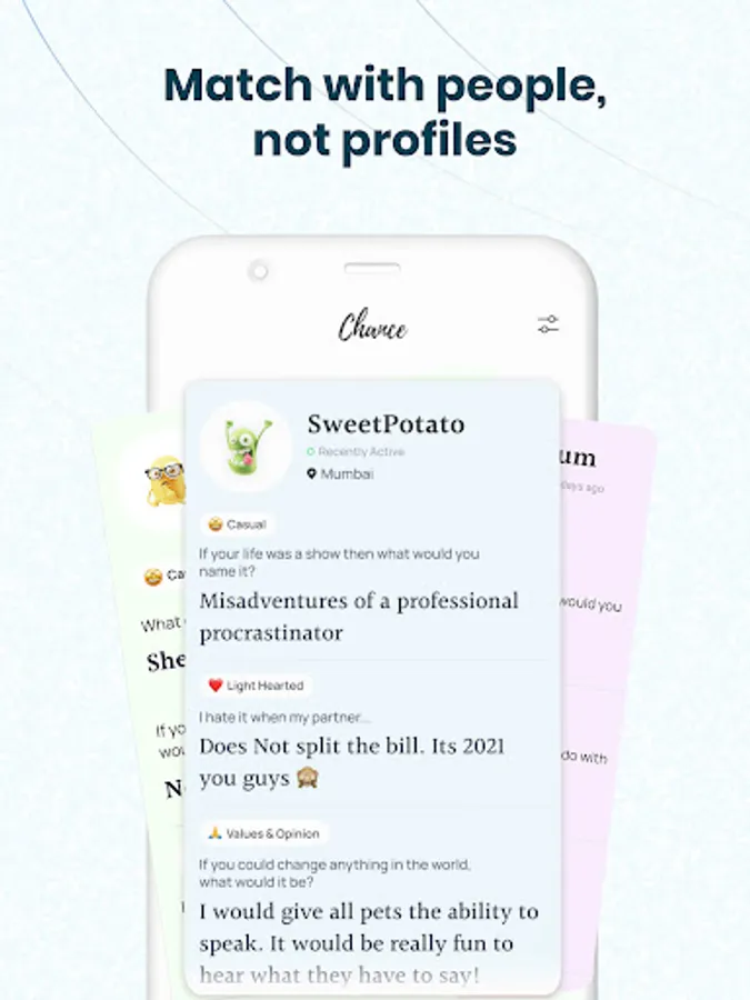 Chance is an intelligent personality-based, pseudonymous connecting and dating app that matches you with people based on personality and interests.