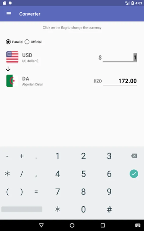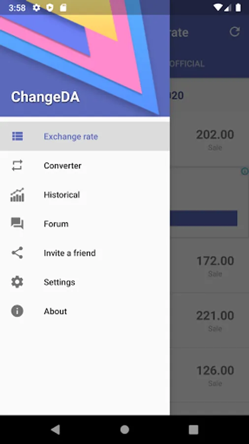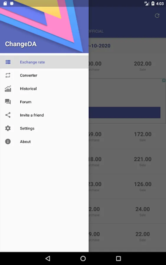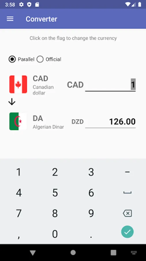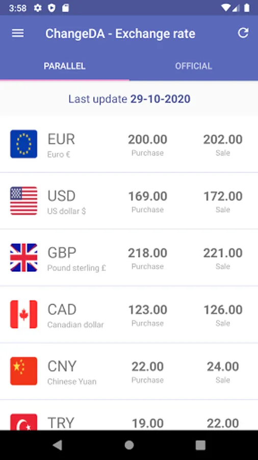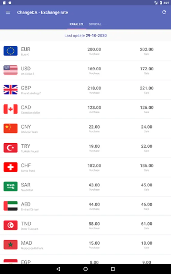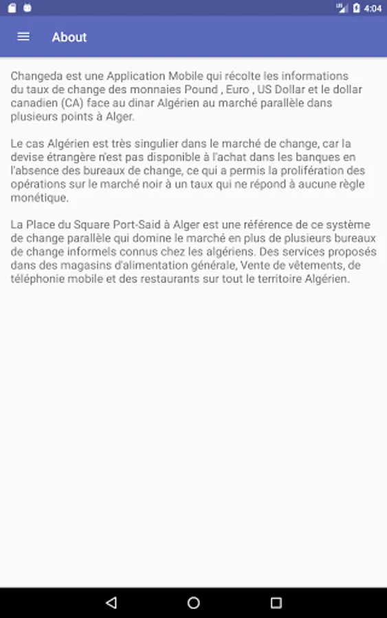 ChangeDA is a Mobile Application that collects currency exchange rate information US Dollar ($), Euro (€), Pound (£), and the Canadian dollar (C $) against the Algerian dinar at the parallel market in several points in Algiers.