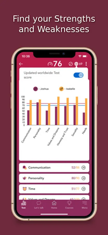 -> You can do the love test as a single or with your partner. In order to see the results of the partner, there is the function to link his / her profile with the partner profile. Now you can compare your results and see your strengths and weaknesses in the relationship at a glance.