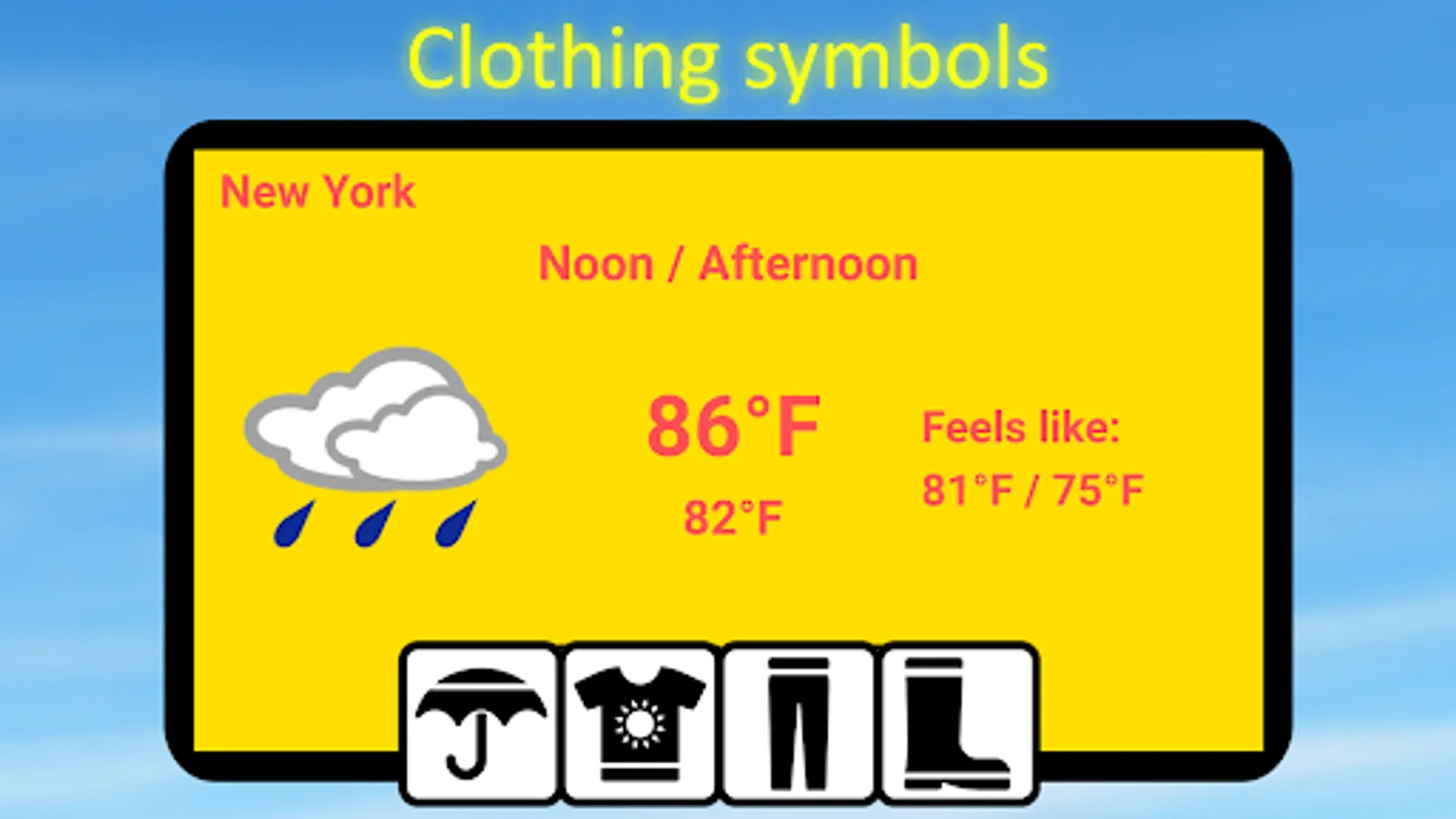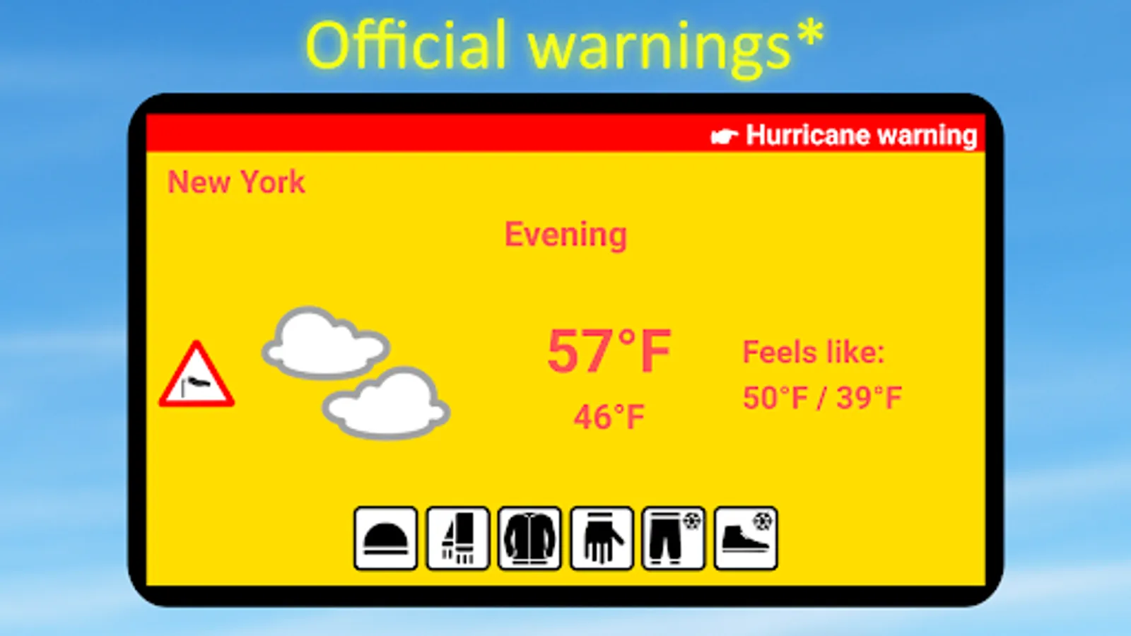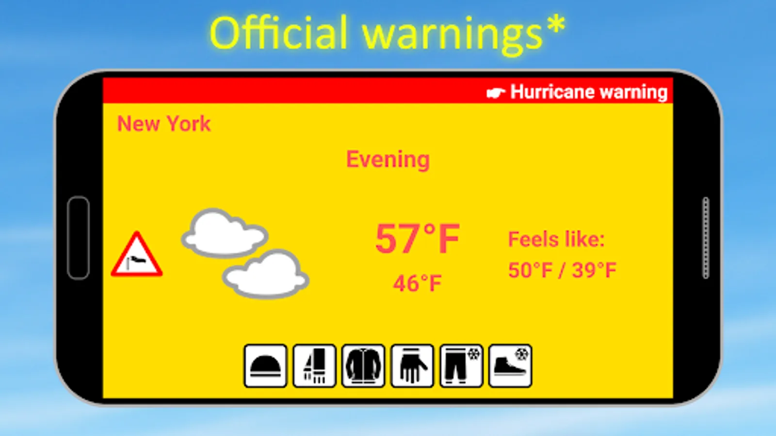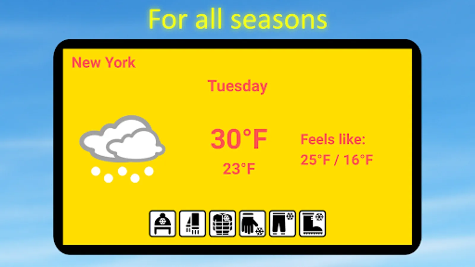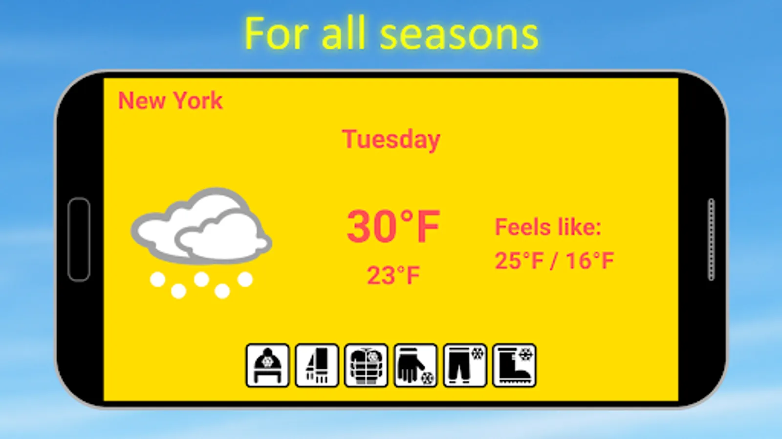 The app recommends thin or thick jackets, scarfs, caps and winter hats for cold weather, thin or thermal gloves and mittens for extreme cold conditions. It simply knows the best weatherproof combination for all conditions.
