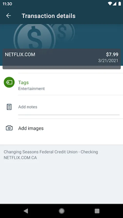 - Keep your transactions organized by allowing you to add tags, notes and photos of receipts and checks.