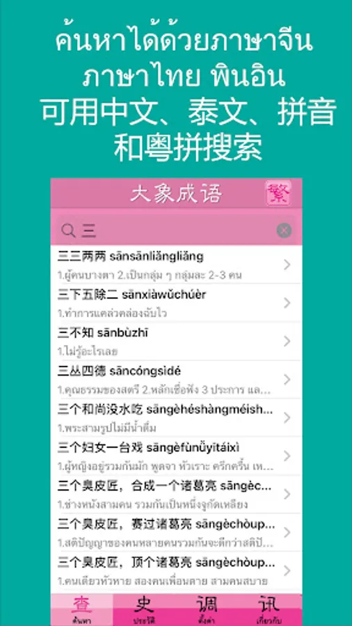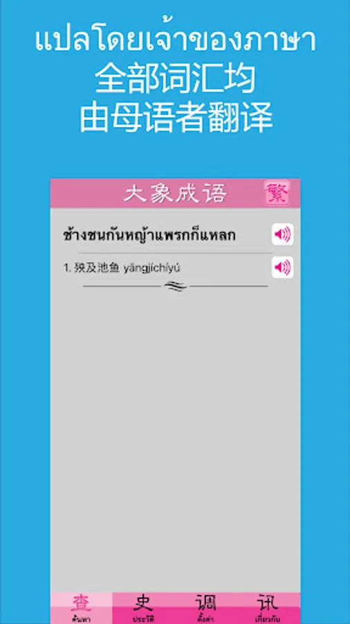 3. You can choose to listen to both Thai, Chinese and Cantonese idioms from the audio recorded by a native speaker.