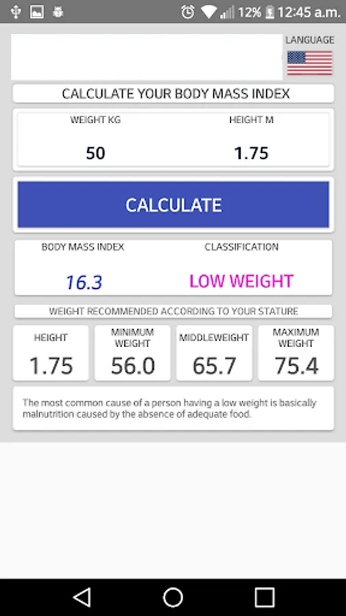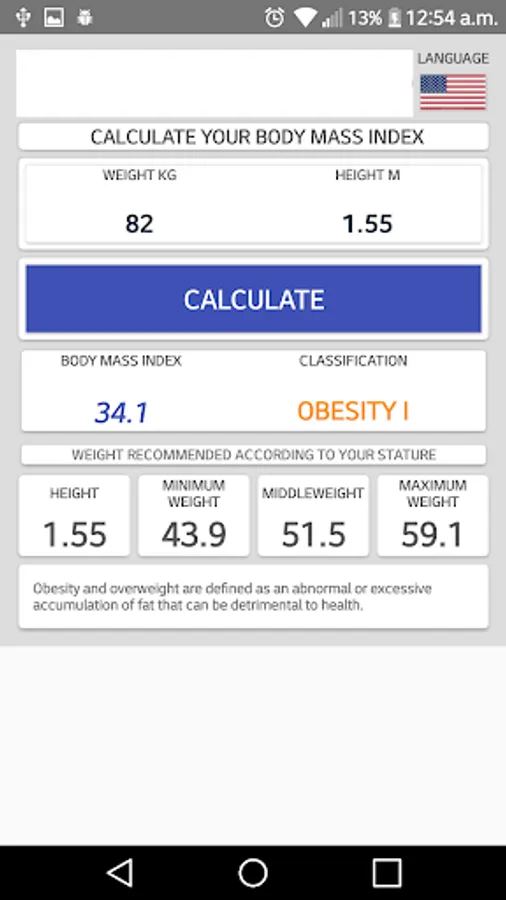 A simple one for the calculation of Body Mass Index (BMI), is calculated by dividing the kilograms of weight by the square of the height in meters (BMI = weight [kg] / height [m2]). ... It is considered that a person is obese if his BMI is greater than 30.