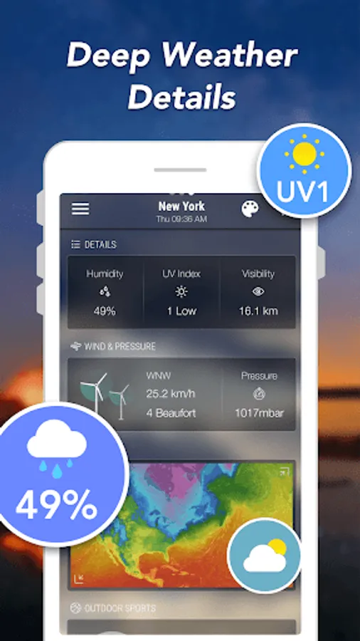 Detailed real-time weather reports, including real-time weather conditions and temperatures, “feeling” temperatures, precipitation, UV index, humidity, visibility, pressure, pollen count, sunrise and sunset times.