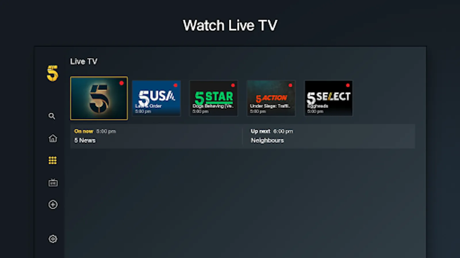 Welcome to the brand new My5 Android TV app from Channel 5, bringing your favourite shows from across the Channel 5 family, including Channel 5, 5STAR, 5USA, 5SELECT and 5ACTION.