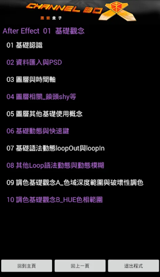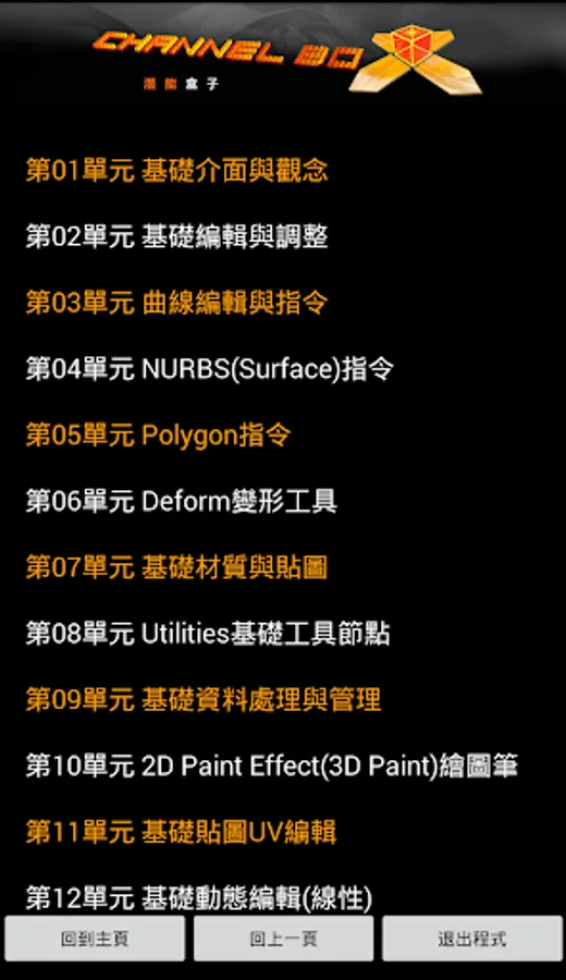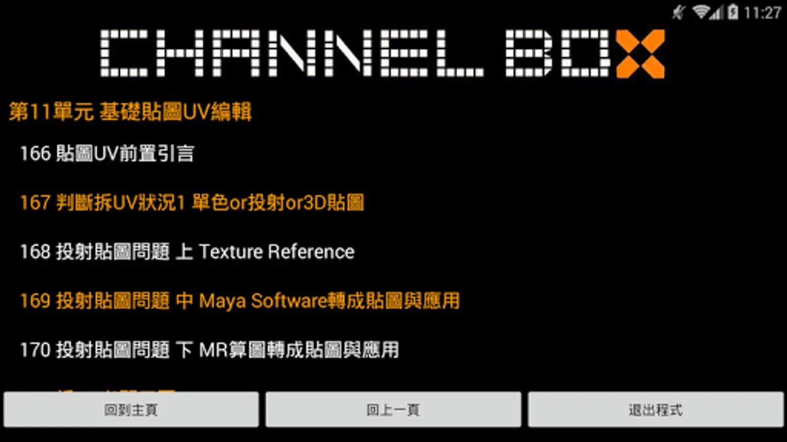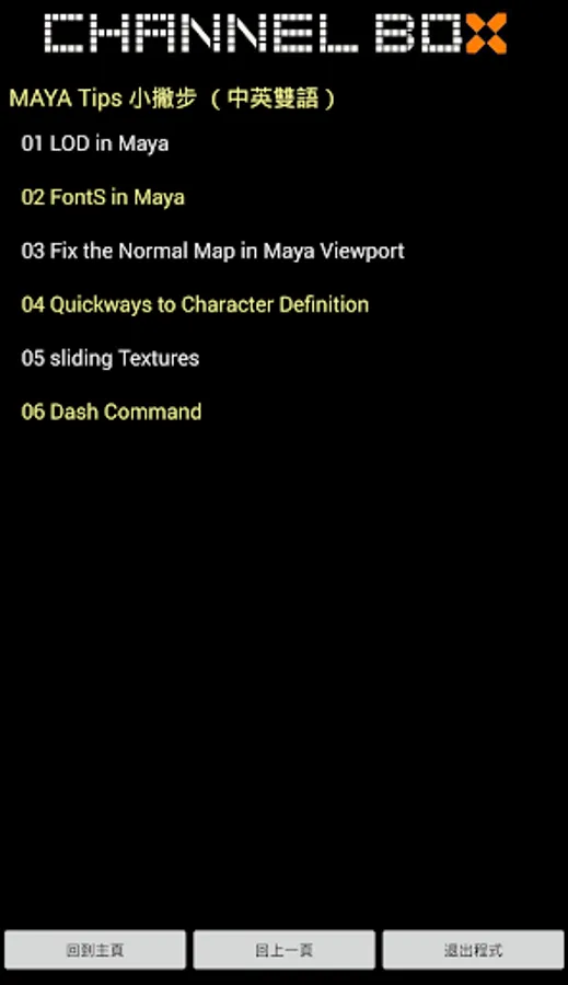 For the people who study Maya and the instructors who is teaching Maya can easily to find the required information is the purpose for building this APP named CHANNELBOX. The future goal is to make this APP more easy to use and more tutorials in other catogaries.