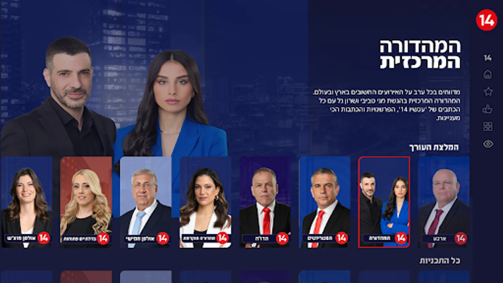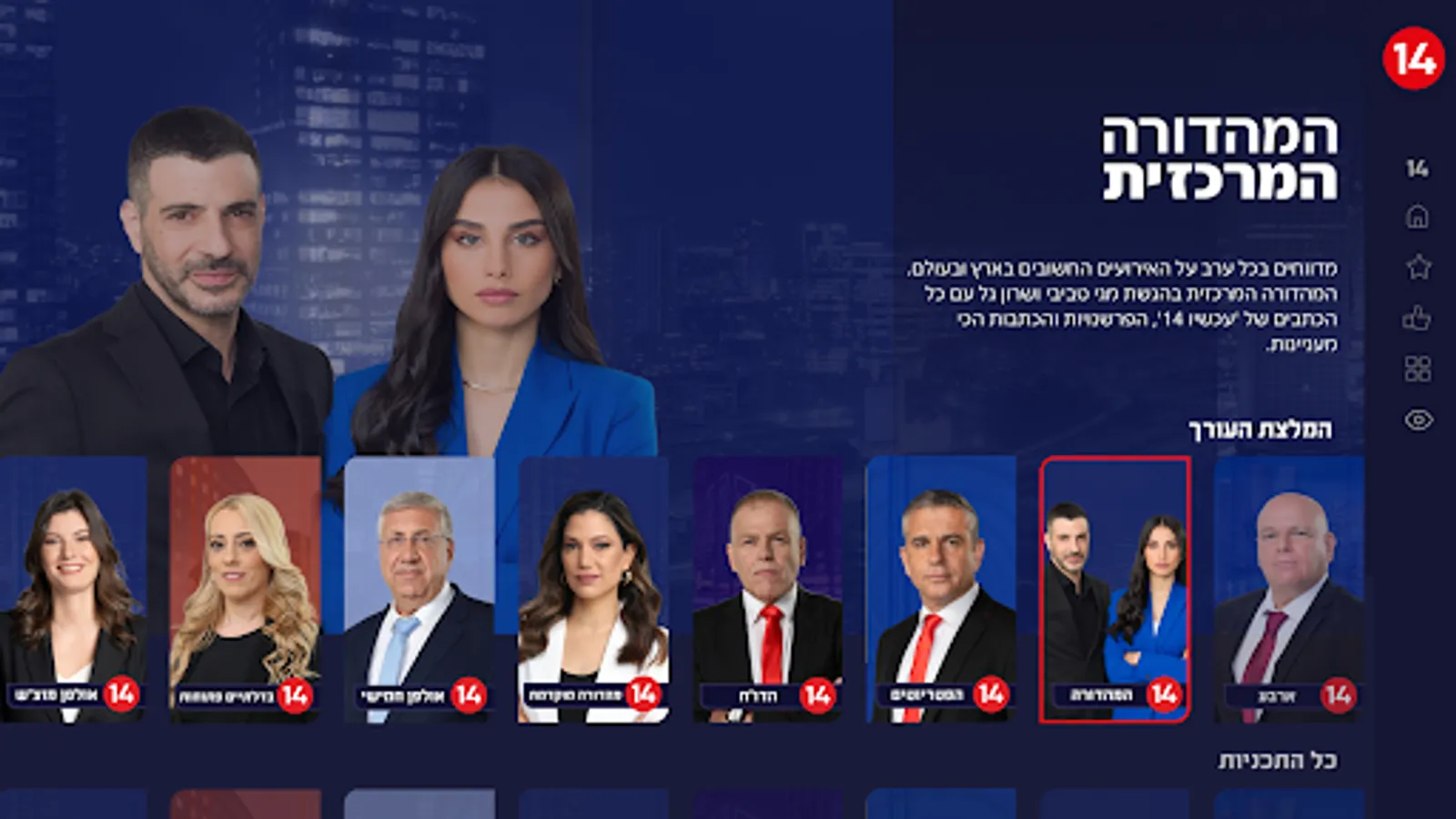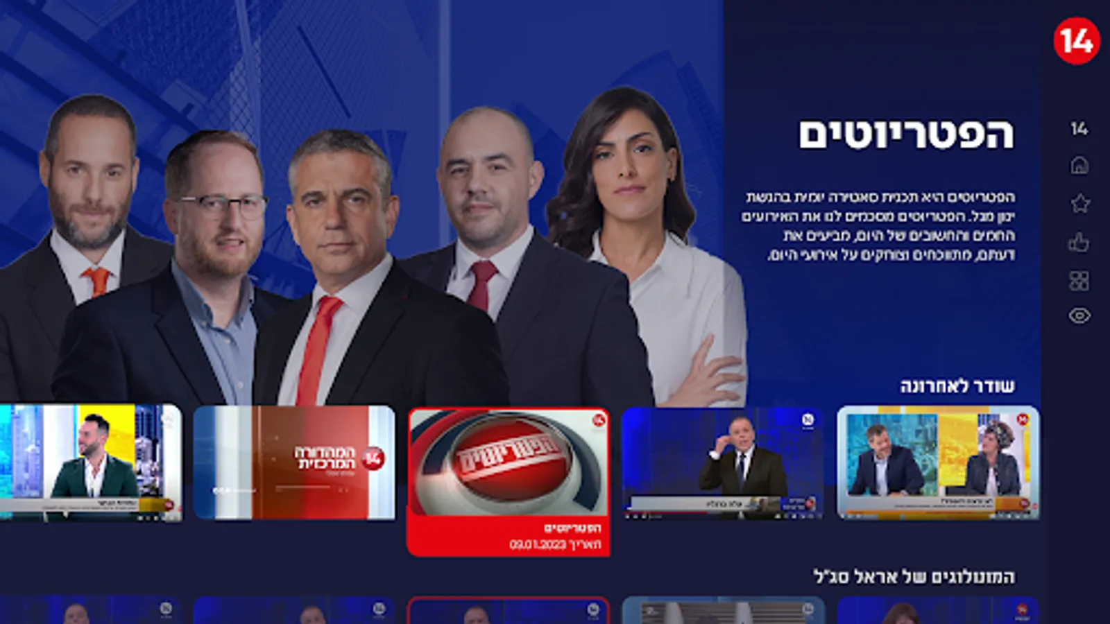 Channel 14's new news app for Android TV, which includes all the most fascinating programs, items, interviews and panels! And of course the live broadcast 24/6! Welcome to download and enjoy
