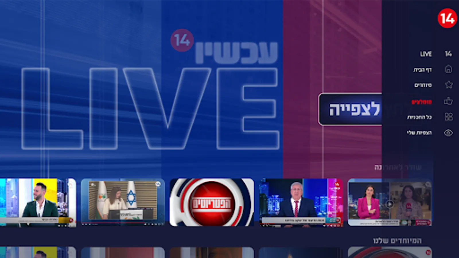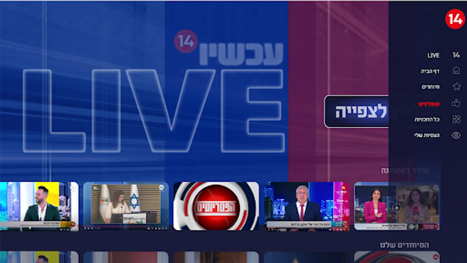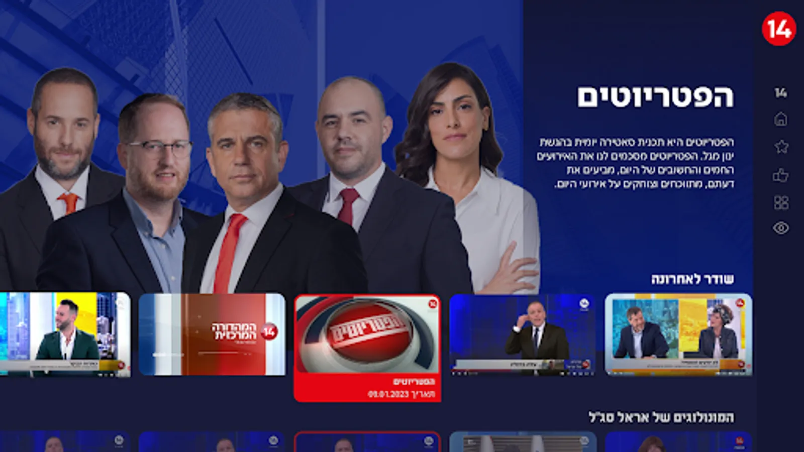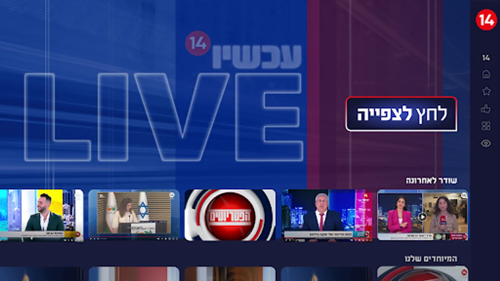 Channel 14's new news app for Android TV, which includes all the most fascinating programs, items, interviews and panels! And of course the live broadcast 24/6! Welcome to download and enjoy