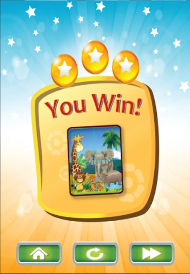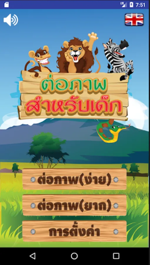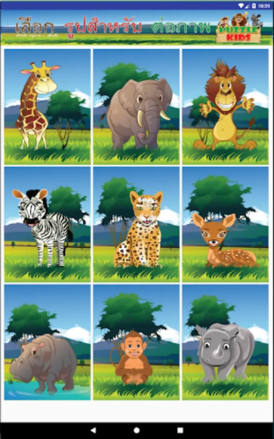 Is a game for creating images of animals such as giraffes, elephants, lions, zebras, hippos and others. Will show the number of stars along with congratulatory sounds for the children to have fun in learning and memorizing. Children can choose Connect images in 2x2 or 2x3 or 3x3 sizes and can also adjust the difficulty or more easily. If easy, there will be numbers in the image. To inform
