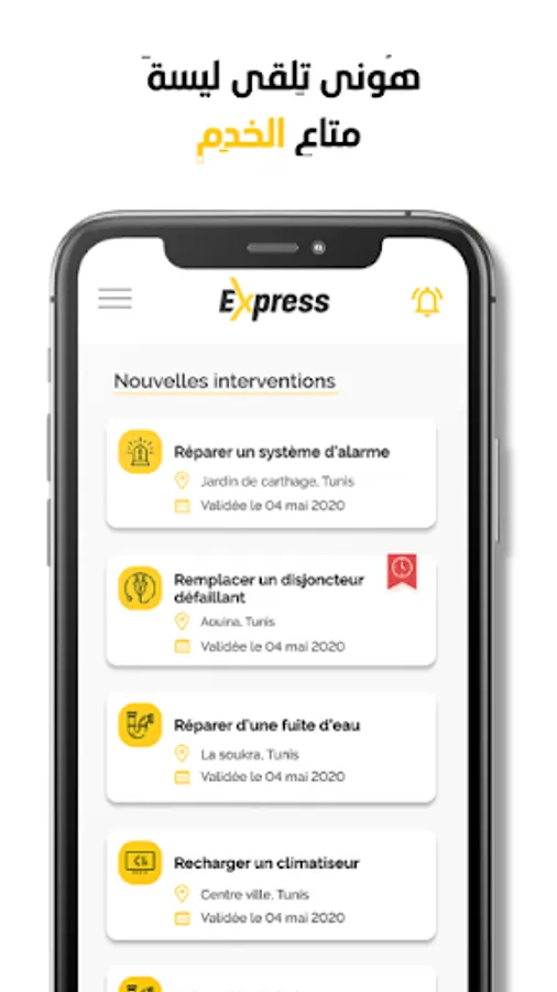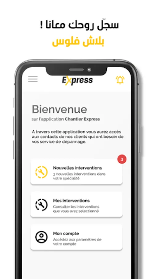The Chantier Express mobile application is intended for breakdown repair professionals and makes available to registered professionals construction site opportunities according to their specialty.