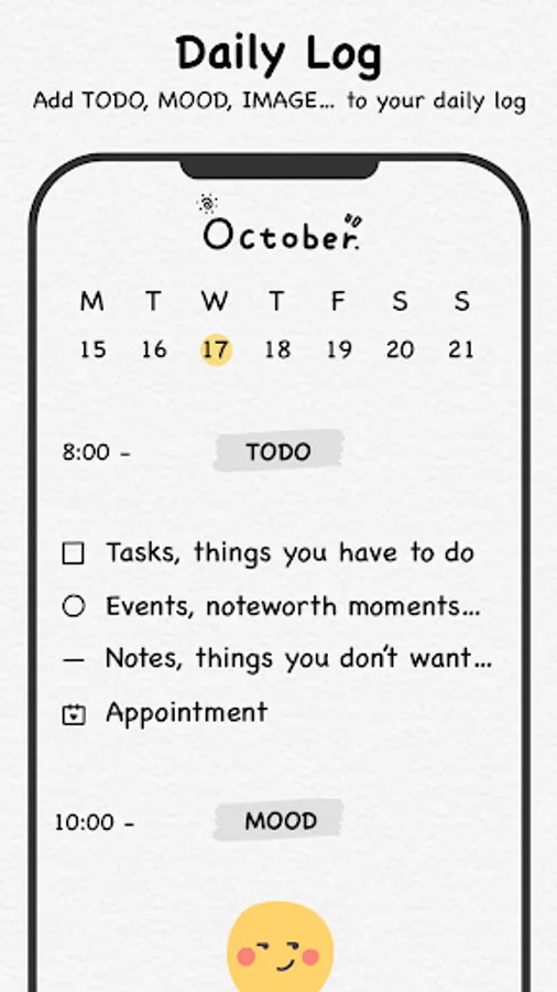 Organize your mood, planning, memories, notes, photos, weather, food, weight, activity, monthlyspread, journalspread, monthlytheme in journaling app free of cost. Progress on your fabulous journey of self care, one step at a time in your mood tracker.