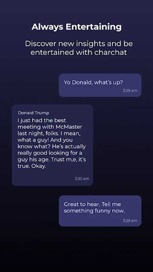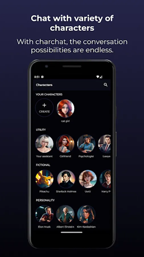 Whether you want to chat with your favorite celebrity, learn from a fictional character, or create your own persona, Charchat provides a seamless experience for meaningful conversations. The app's cutting-edge AI technology enables natural, engaging interactions that are sure to entertain and enlighten users.