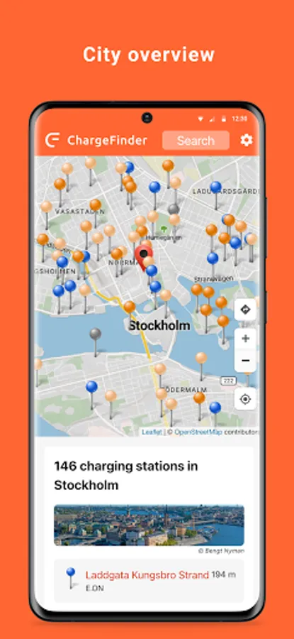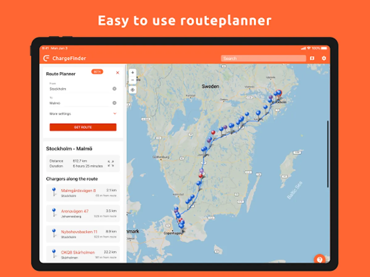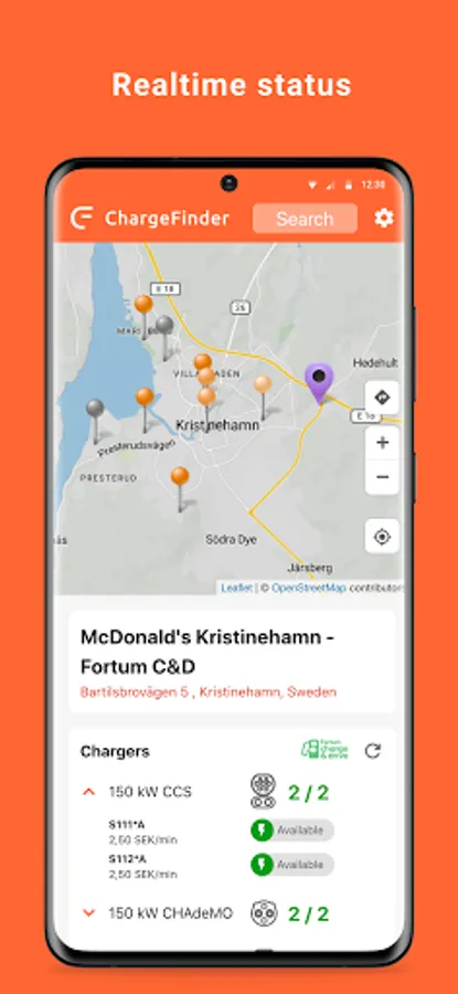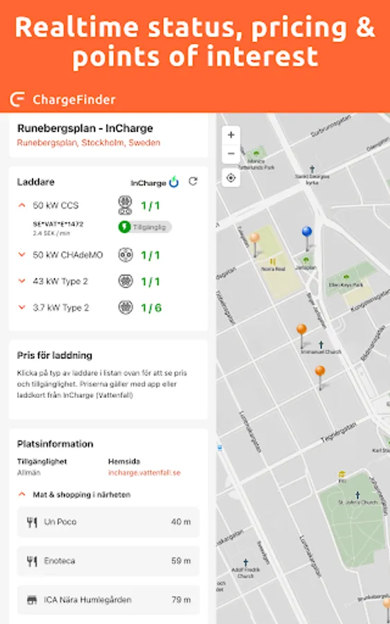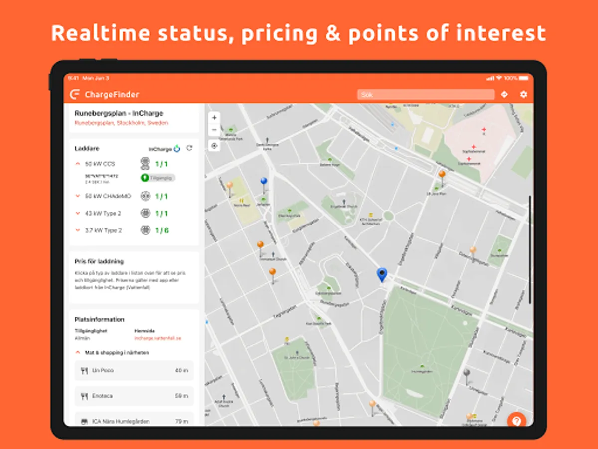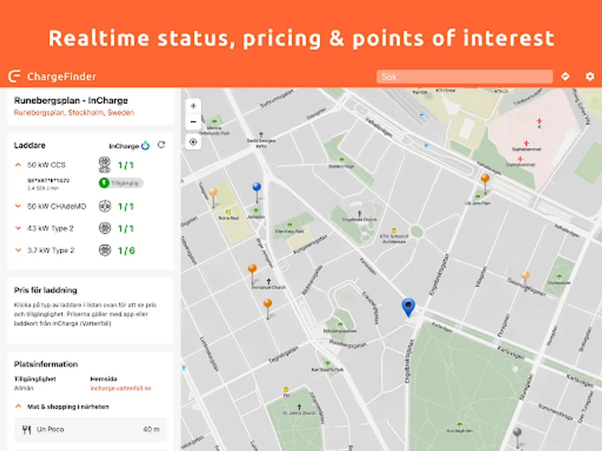 Find charging stations on the charge map and get information about charging speed, current prices and availability in real time. Live charger status is displayed for all major networks in Scandinavia and several in rest of Europe. In one place you can now see if a charger is idle, busy or out of order regardless of operator. Tips on nearby eateries and other things that can be good to know about the specific place are of course also available.
