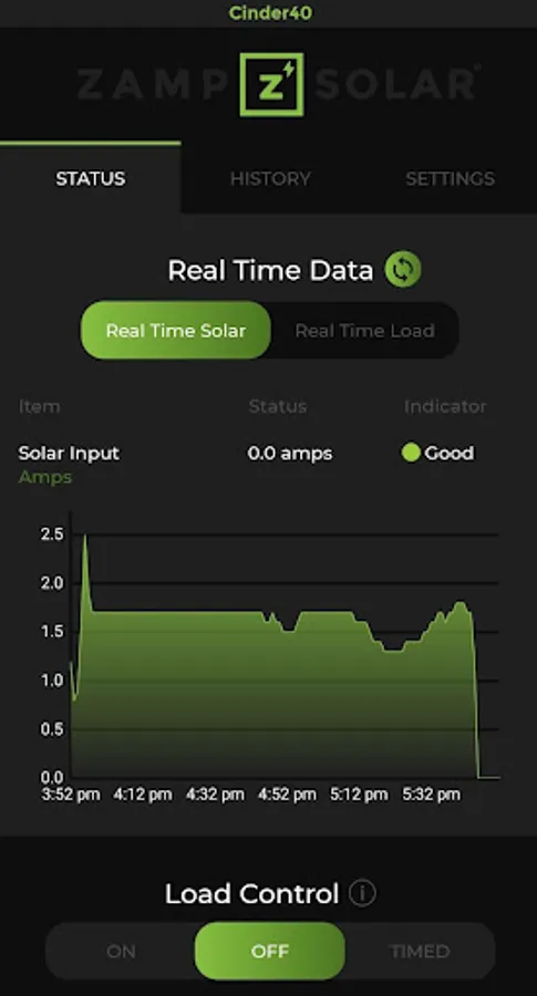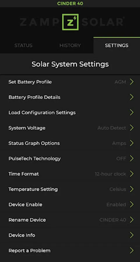 The Zamp Solar App allows you to connect directly to the Zamp Solar CINDER™40 Solar Charge Controller via the built-in Bluetooth module to view live and historical statistics, set battery profile, control Load Output Circuit, and update the firmware when necessary all from your mobile device.