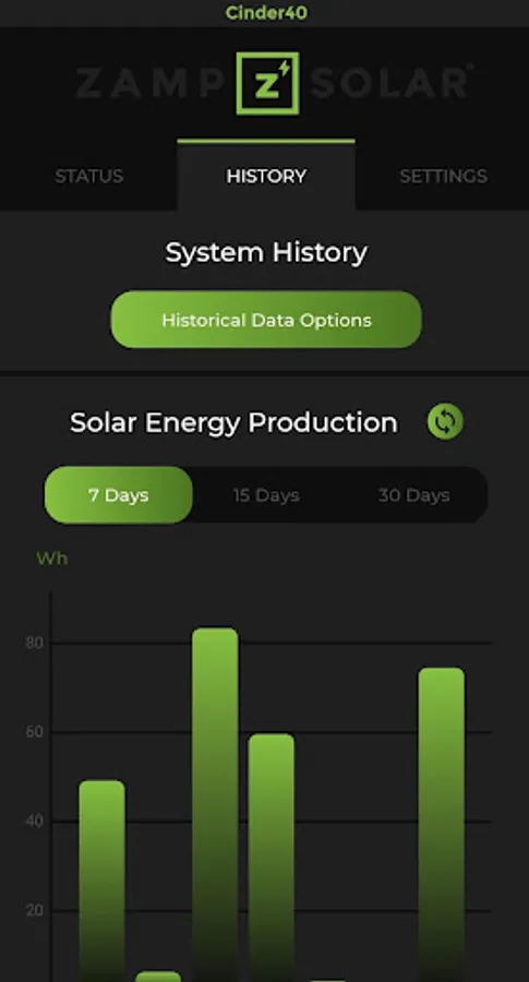 Check-in on your system as you wish with 7, 15, & 30 Day system history data. Here you can see information such as, 30 Day Daily Energy Generation, Highest Recorded Amperage, Average 24 Hour battery Voltage, and more!