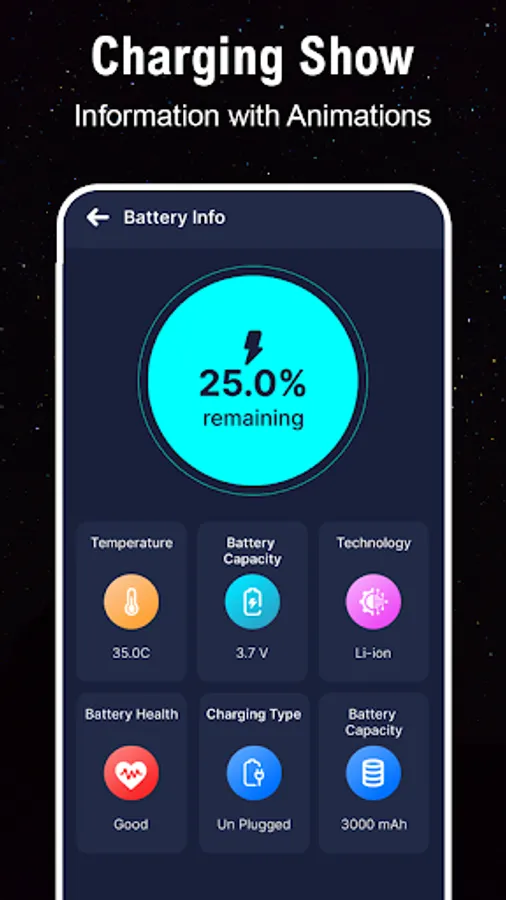 Charging animation also has a tool to get & know battery information, Battery Temperature, Voltage, Technology, Health, and battery percentage of your mobile device.