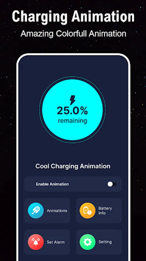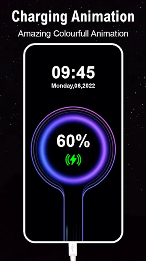 Easy to use free Battery Charging Animation app - Battery Charging show Screen on your phone. The super animation appears on your phone screen when the phone charger is connected. This charging animation comes with beautiful neon color effects and cool charging animation. Charging show animation when you enable and allow it from the phone settings. You can stop the charging animations and save your charging battery power by disabling the animation option of the app. Users can also minimize on-screen charging animation simply by double tab on the screen.