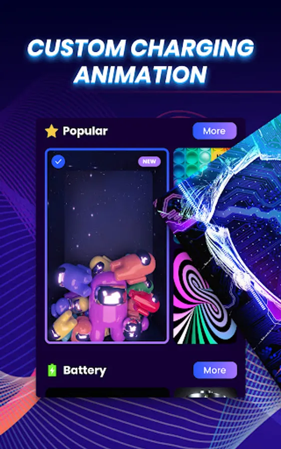Create your own charging animation by uploading a photo or video from your gallery. You can customize your own charging animation by adding charging sound, picking charging progress icon and choosing charging icon color.