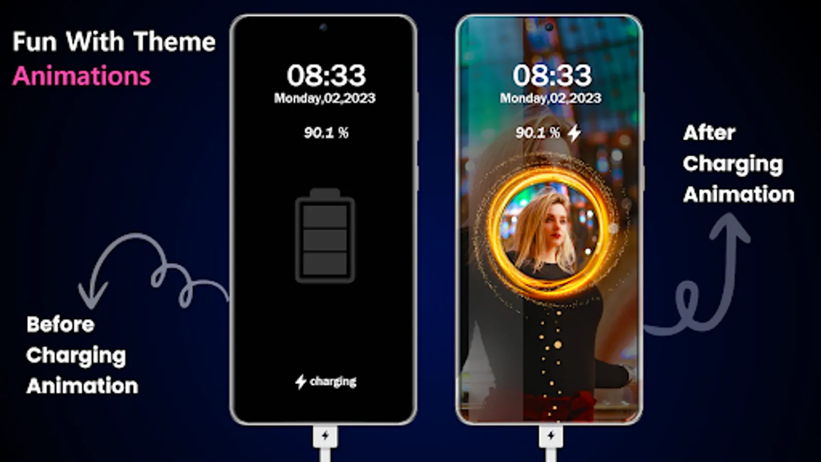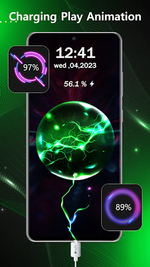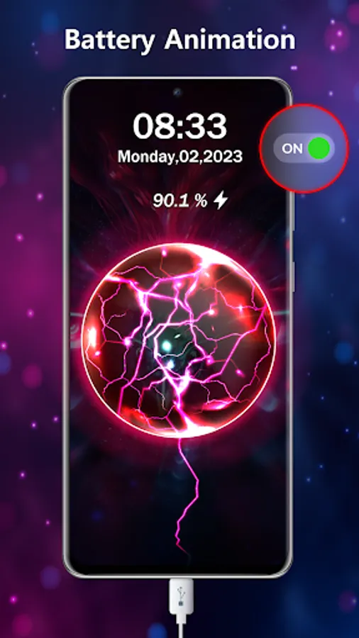 Battery charger animation application comes with many functionalities like checking battery info, set charging wallpaper, display charging time, battery alarm on full charge, and various charging animations. Charging play theme style in our charging app will give different charging fun animations over to your phone charging screen. This lock screen battery charge animation app also provides the battery data and a live charging show, which is displayed on your lock screen after you plug-in the charger.