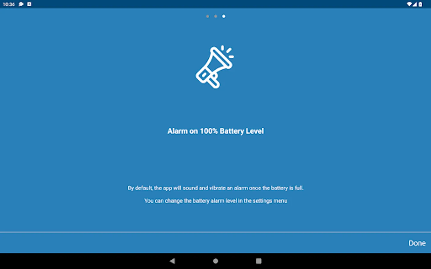 This app notifies you when your battery is "FULLY CHARGED" , "CRITICALLY LOW" and "Overheated" to protect your Smartphone from problems like Overcharging, Heating, Hanging, Low Battery Backup, Draining, etc.. You can also select battery level and many customizations from the settings screen.