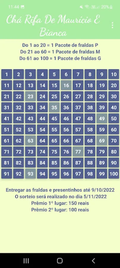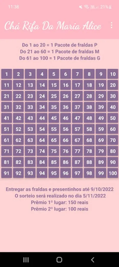 With this application it is possible to organize a raffle tea (diaper tea) for your baby, in it you can define the prize(s), draw date, name and sex of the baby and it is still possible to carry out the draw, which will join the numbers defined as "paid" in the list of chosen numbers. This is the Pro version of the original application, it is necessary to log in with e-mail and password, so your Chá Rifa data is safe in the cloud and can be restored in case of uninstallation, it is also possible to log in on multiple devices by keeping the synchronized data.