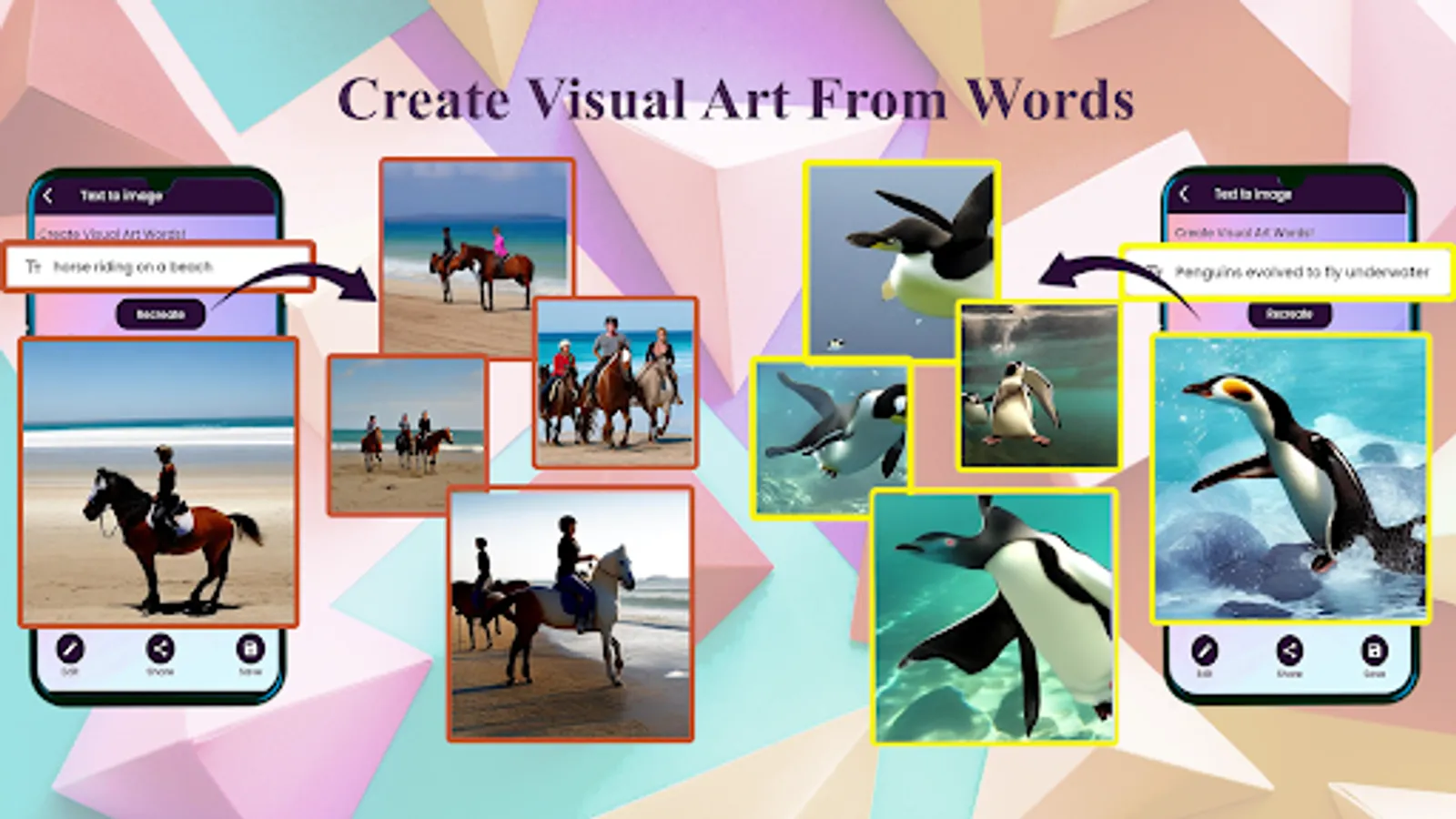Want to see a BBQ party on Mars or a group of cats having a tea ceremony? Do you want to convert your dreams to reality? Here you have chance to transform anything that comes to your mind into stunning pieces of AI Dream Art Work. With text Art: AI Image Generator, you can easily create unique and beautiful artwork using the newest Artificial Intelligent technology. Just enter what’s come in your mind style and allow Pic Art Generator amaze you with unpredictable AI Painting & Drawings in seconds. Moreover, the app inherits a professional photo editor toolbar which permits the user to add pictures, photo frames, text & stickers on your dream art. Last but not the least you can save your images in an in-app dedicated album and share them with friends & family or on social media via any platform including Whatsapp, Instagram, Facebook, Twitter, Snapchat & Tiktok.